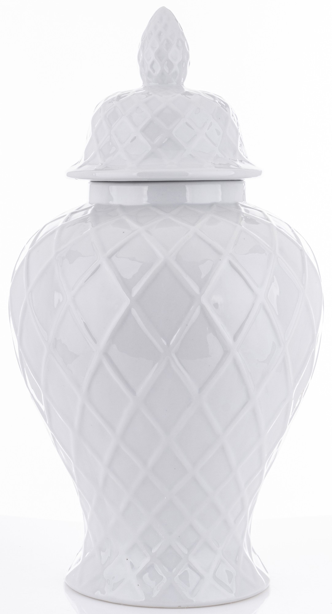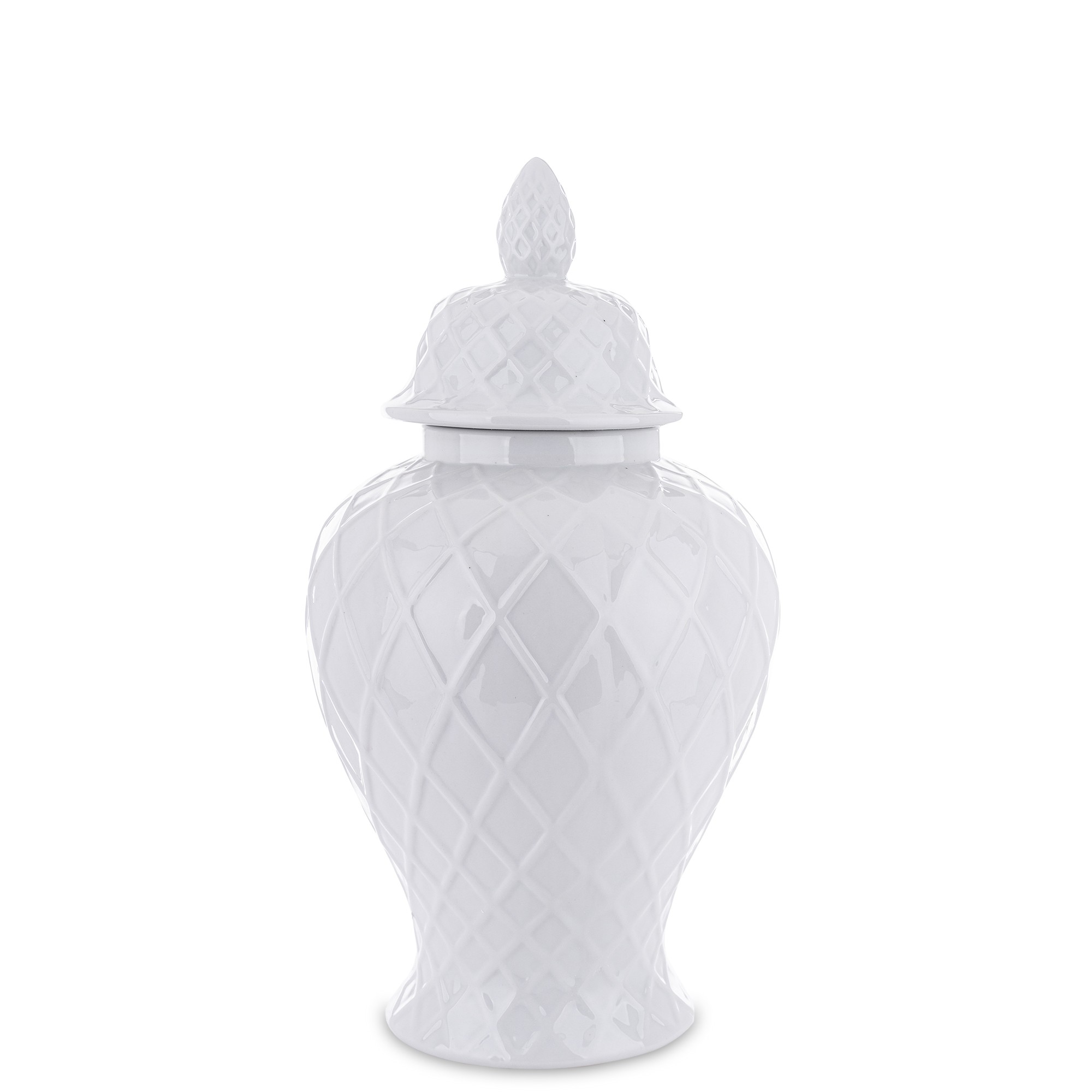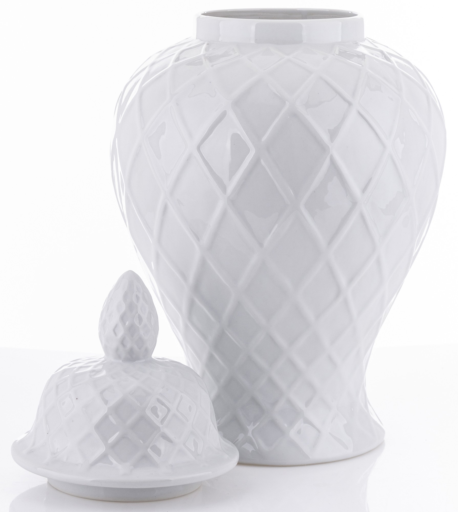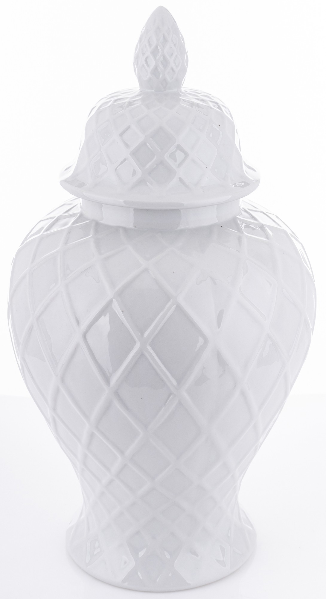 Ceramiczna amfora Linea2 to harmonijne połączenie prostoty i elegancji. Produkt w kolorze białym, z geometrycznymi liniami układającymi się w delikatny wzór, stanowi wyjątkowy element dekoracyjny dla każdego wnętrza.