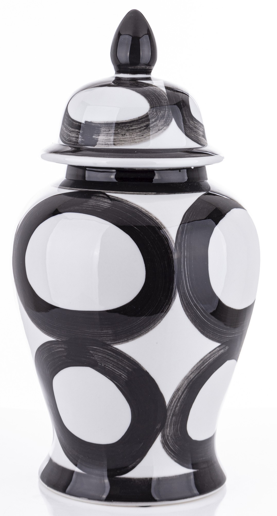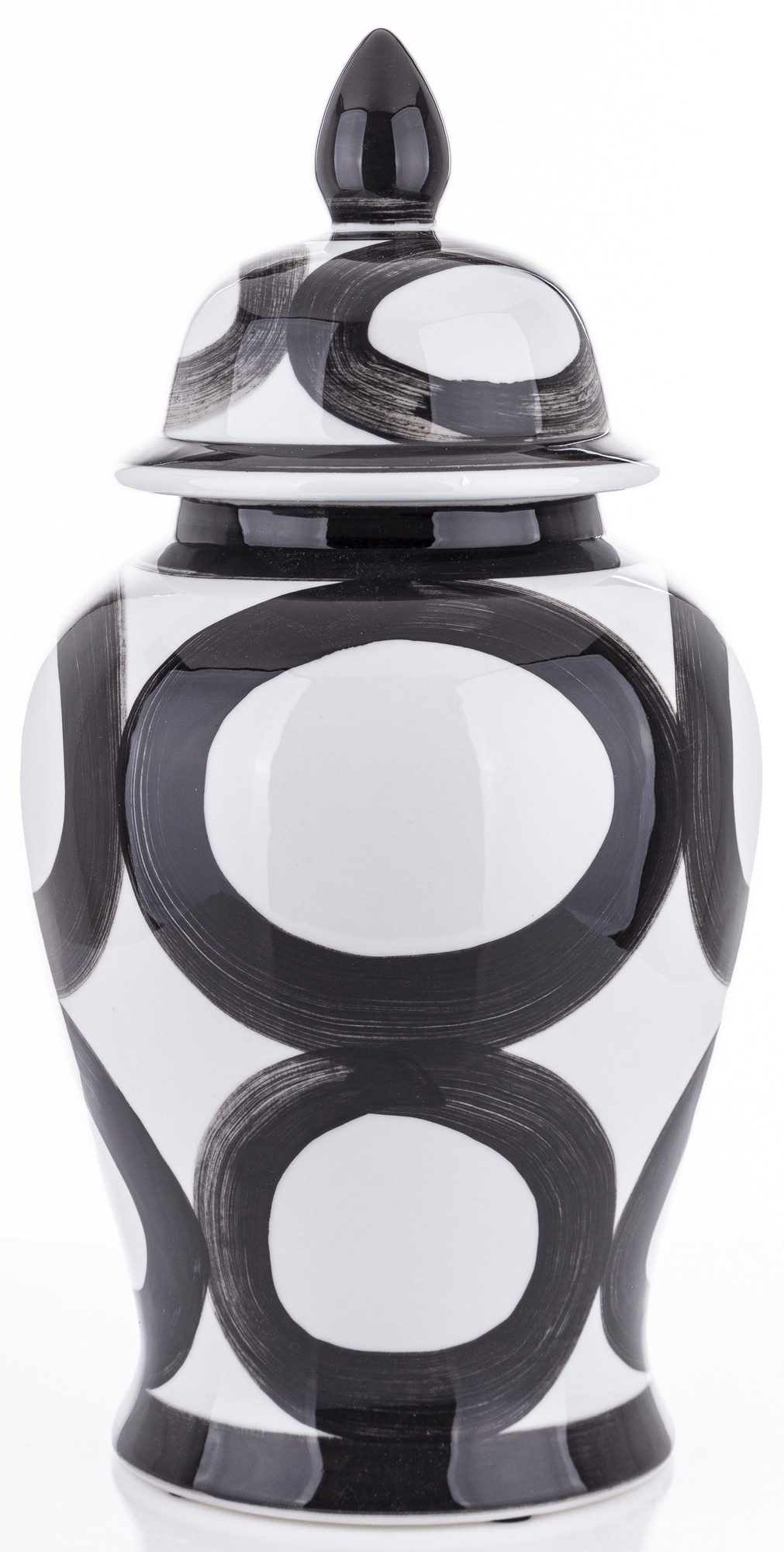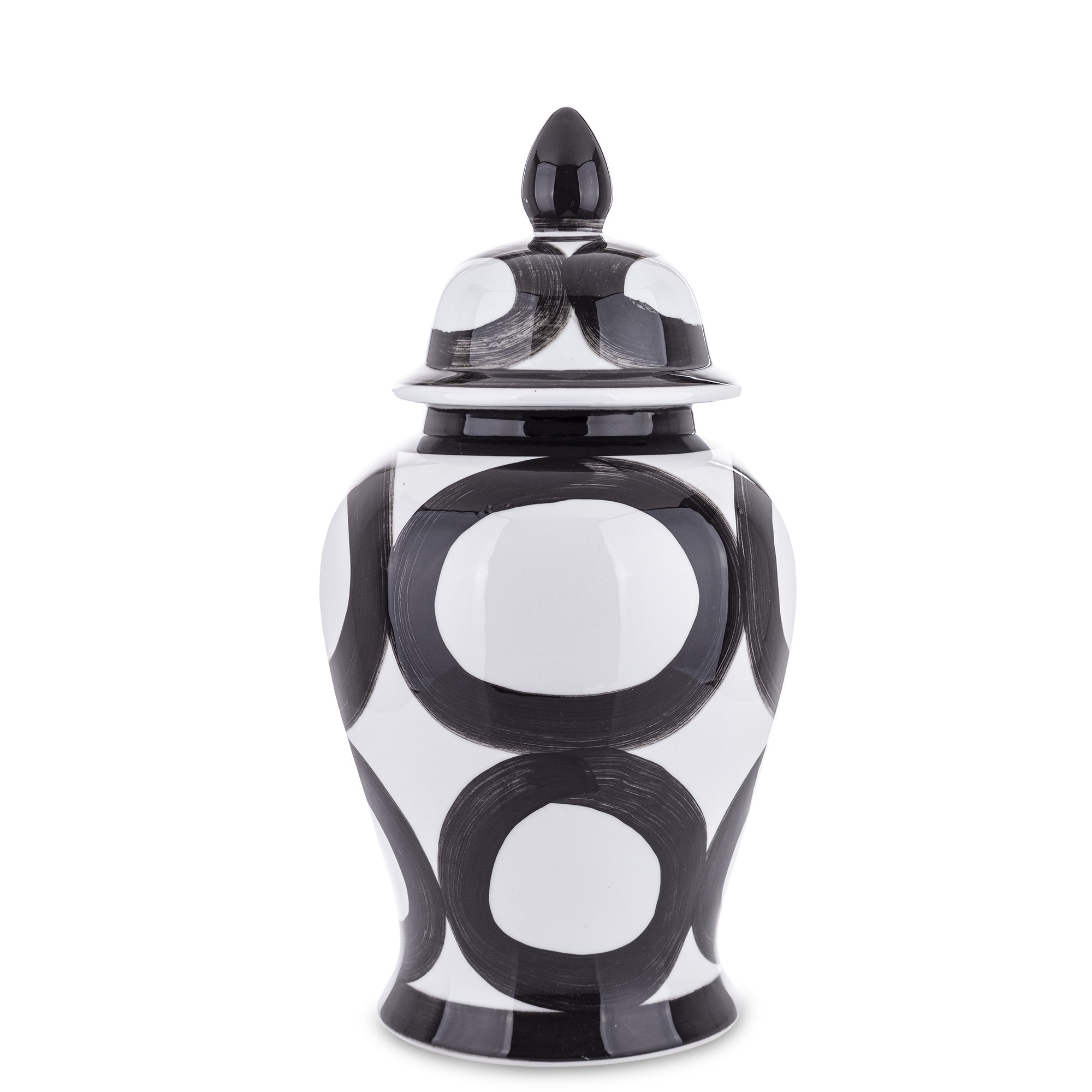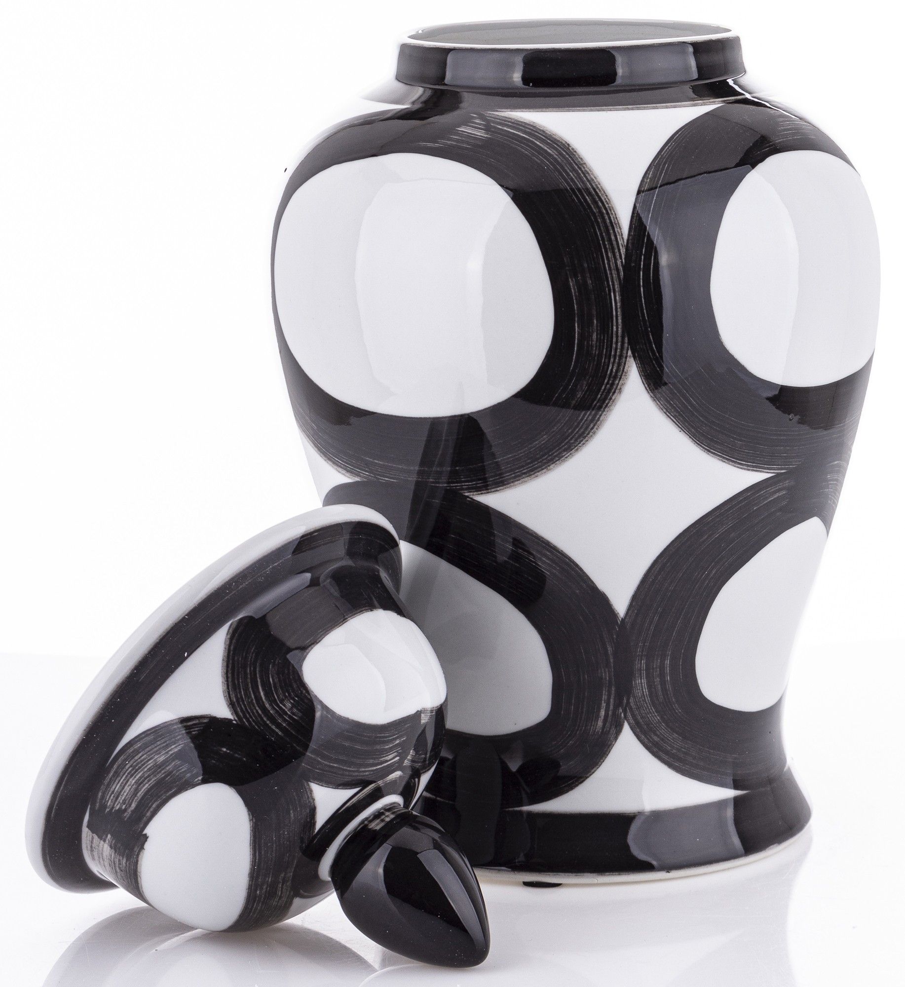 Nasza ceramiczna amfora Okręgi to elegancki pojemnik, który łączy w sobie funkcjonalność z wyjątkowym designem. Została mistrzowsko wykonana z ceramiki, a jej powierzchnia ozdobiona jest klasycznym wzorem czarnych kół. Doskonała do przechowywania różnorodnych przedmiotów, kwiatów lub jako dekoracyjny akcent w każdym wnętrzu