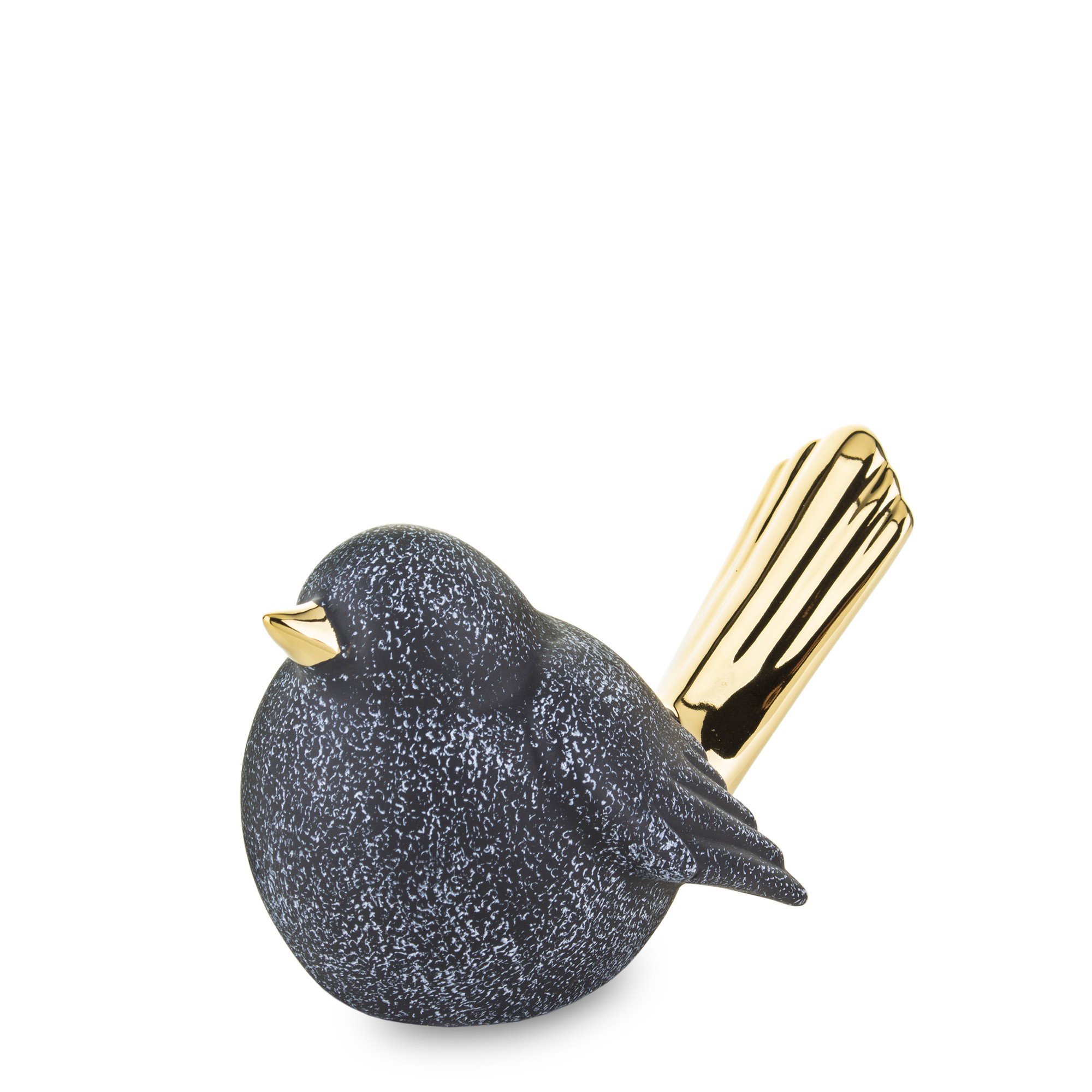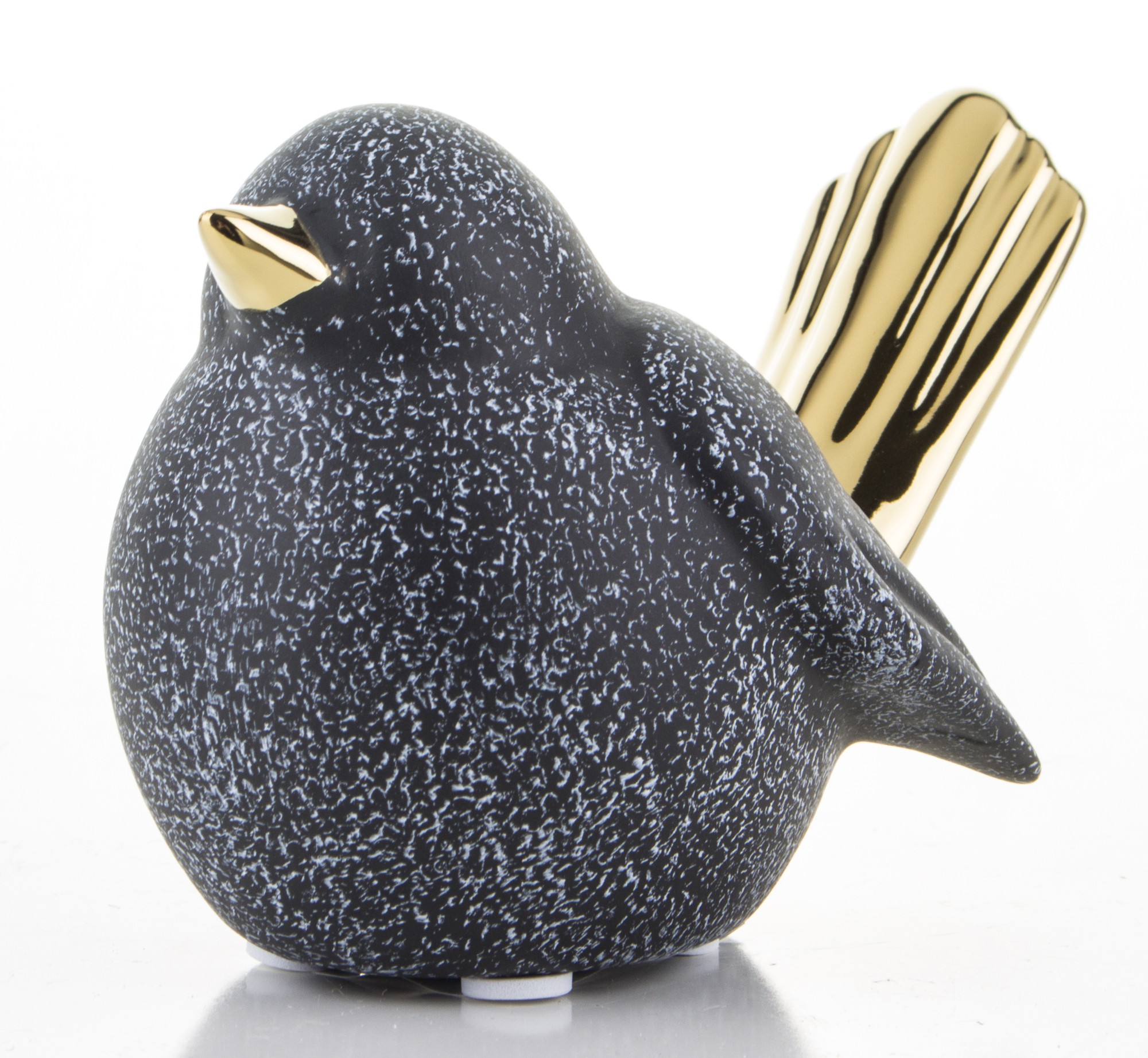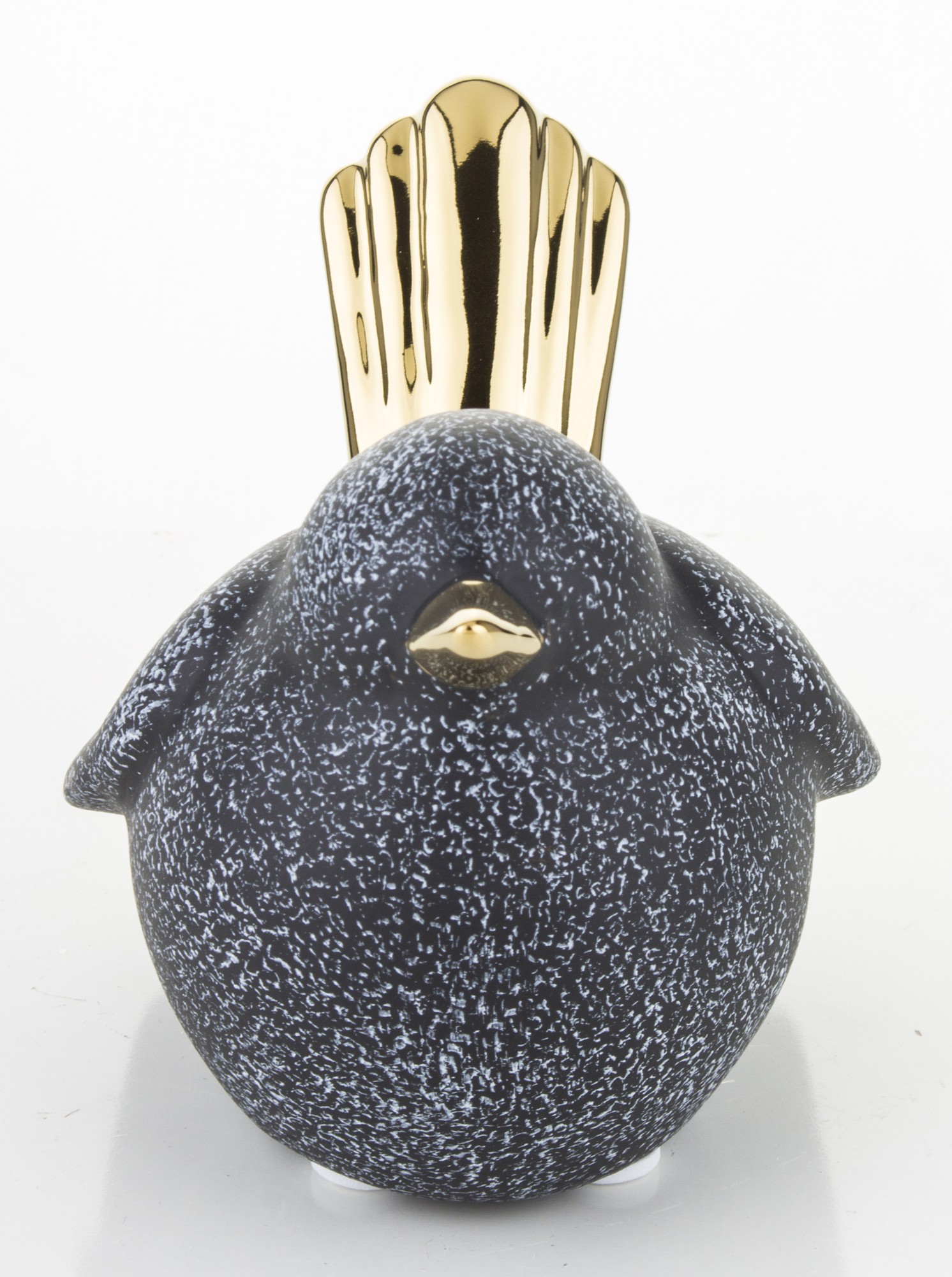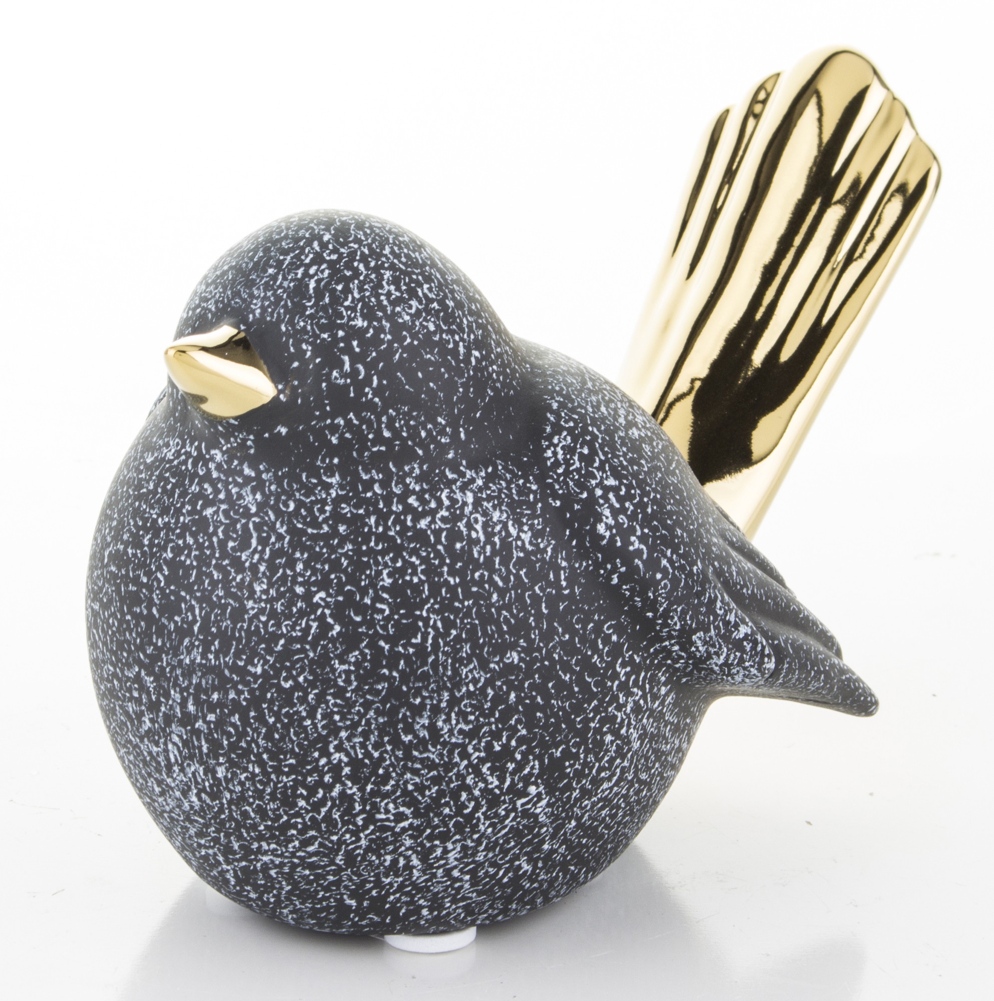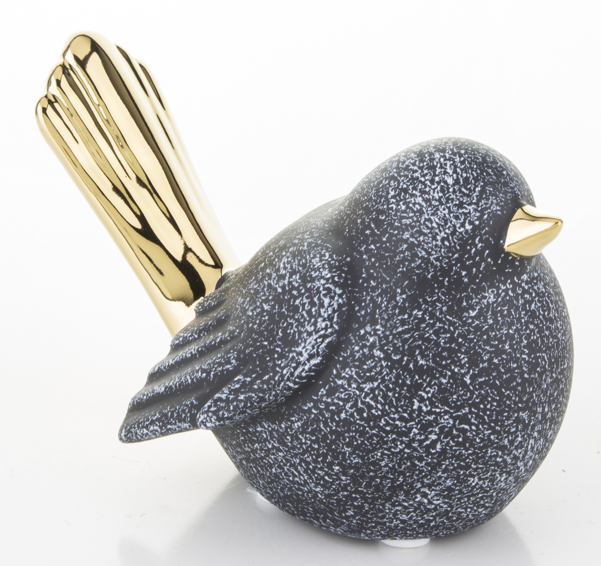 Ceramiczna figurka ptaka w kolorze czarnym z białymi plamkami i złotymi akcentami to elegancki dodatek do każdego wnętrza. Mały złoty dzióbek i długi ogon podkreślają jego wyjątkowy design, a pękaty brzuszek dodaje uroku. Rozmiar figurki to 8x13x8 cm. Idealna na prezent lub do własnej kolekcji.