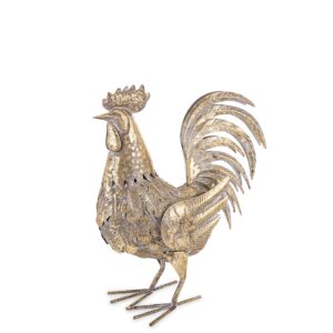 Metalowa rzeźba koguta w kolorze złotym o wymiarach 77x54x20 cm i wadze nieco ponad 3 kg to wyjątkowa ozdoba. Precyzyjnie podkreślone detale dodają jej elegancji i uroku. Kogut symbolizuje odwagę, czujność i nowy początek, czyniąc tę rzeźbę nie tylko piękną dekoracją, ale także talizmanem.