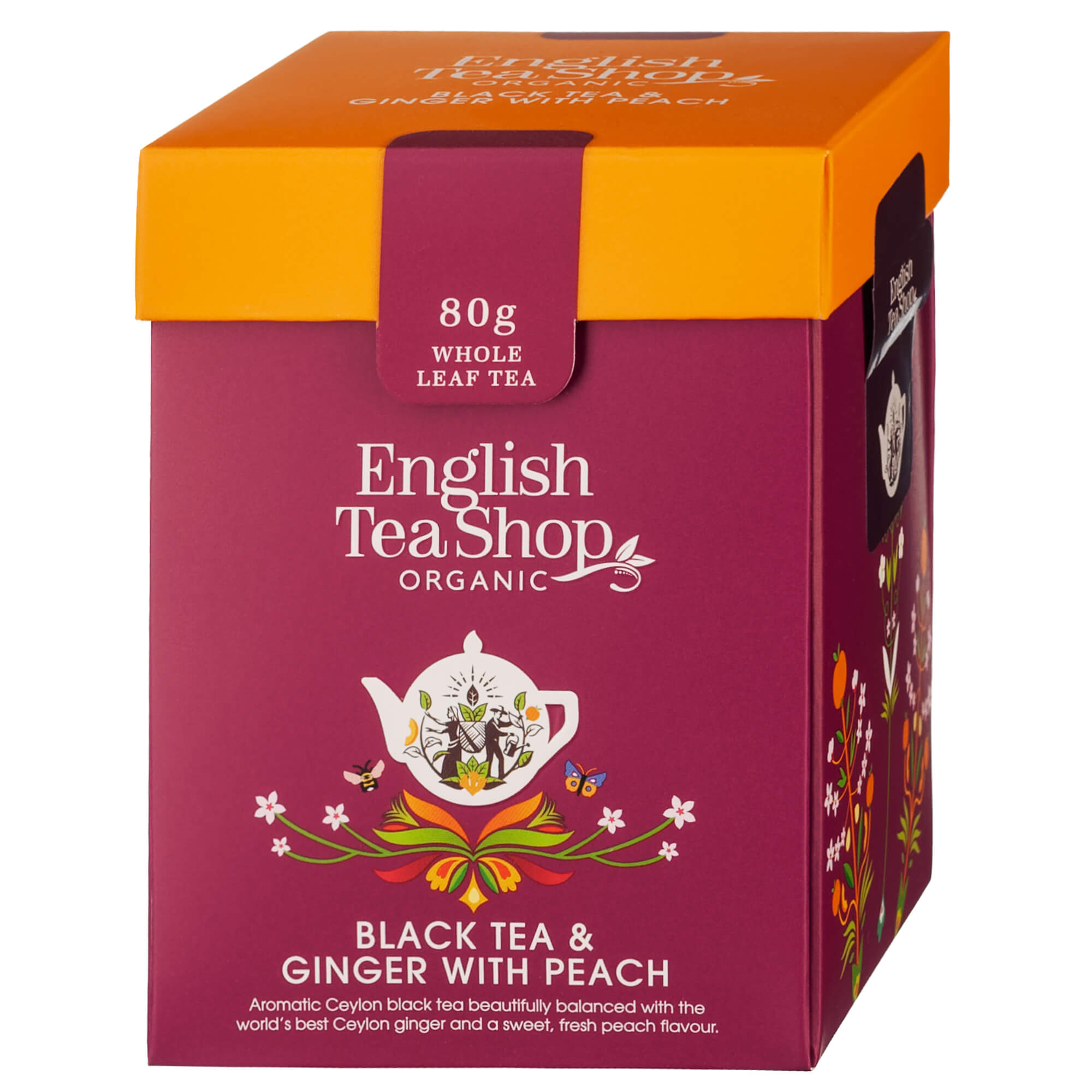 English Tea Shop Black Tea & Ginger with Peach – organiczna czarna herbata z dodatkiem imbiru i brzoskwini. Harmonia intensywnych smaków z delikatną słodyczą.