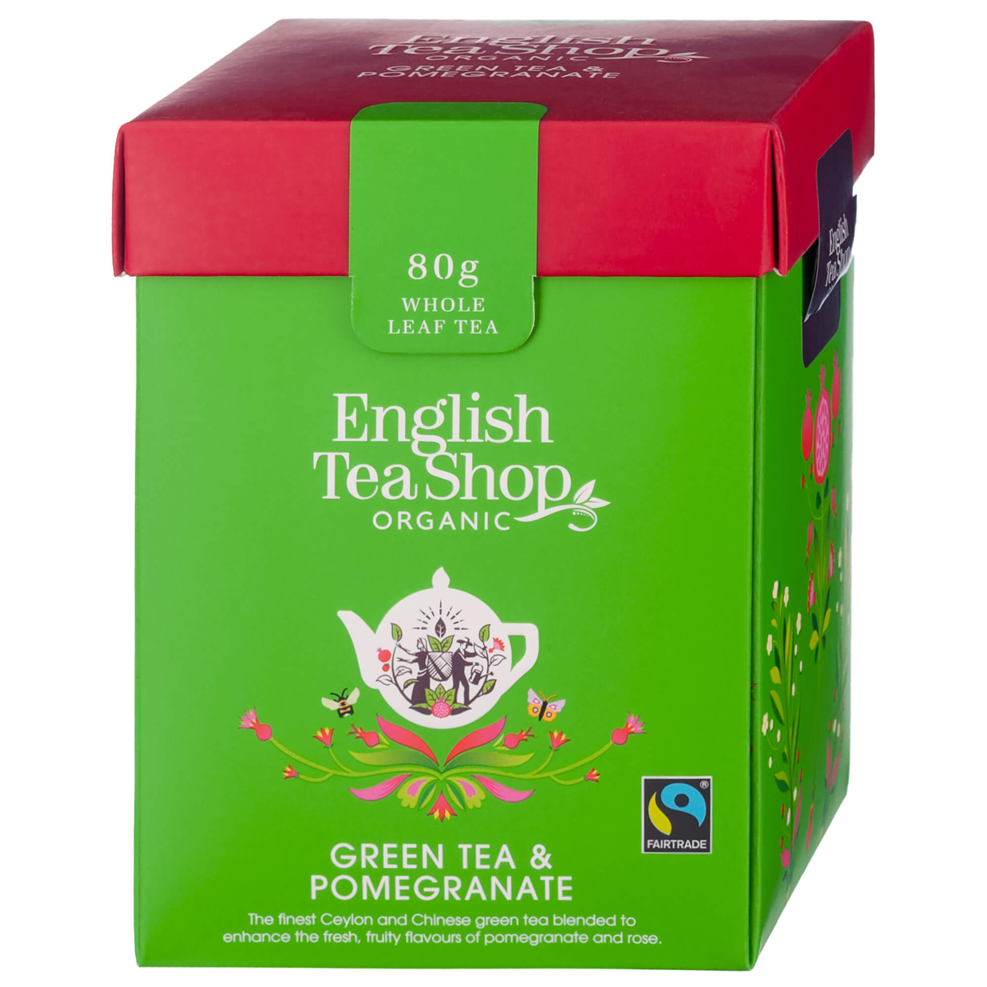 Herbata English Tea Shop Organic Green Tea & Pomegranate to orzeźwiająca mieszanka zielonej herbaty z delikatną nutą granatu i róży. Idealna na każdą porę dnia.