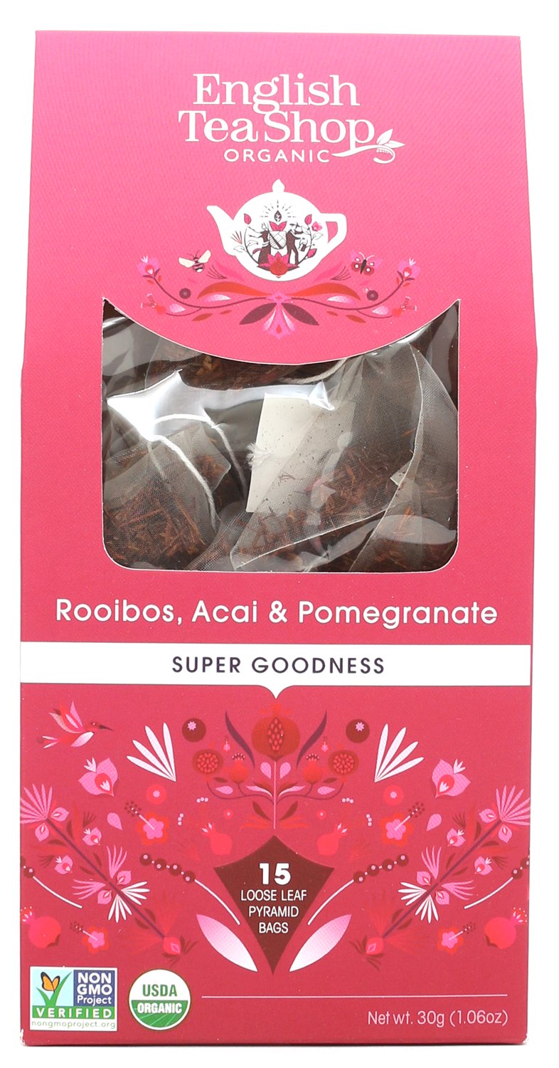 Super Goodness od English Tea Shop Organic z rooibosem, acai i granatem to wyjątkowa, owocowa mieszanka, która dostarcza naturalnej słodyczy i antyoksydantów. Idealna dla zdrowia i dobrego samopoczucia!