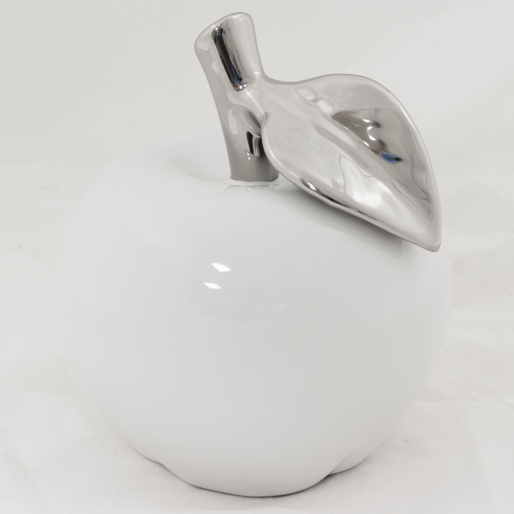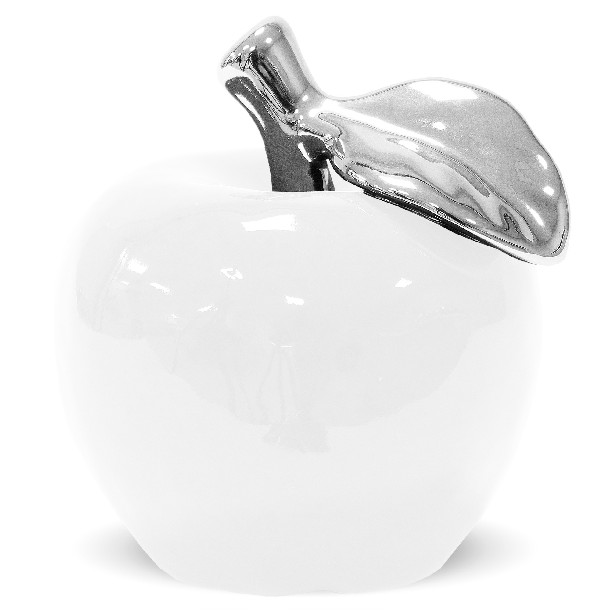 Białe ceramiczne jabłko dekoracyjne ze srebrnym listkiem to elegancki dodatek do Twojego wnętrza. Przyciąga wzrok swoim prostym, ale stylowym designem. Idealne na półkę, komodę lub stół. Jego wymiary to 11,5x10x10 cm.