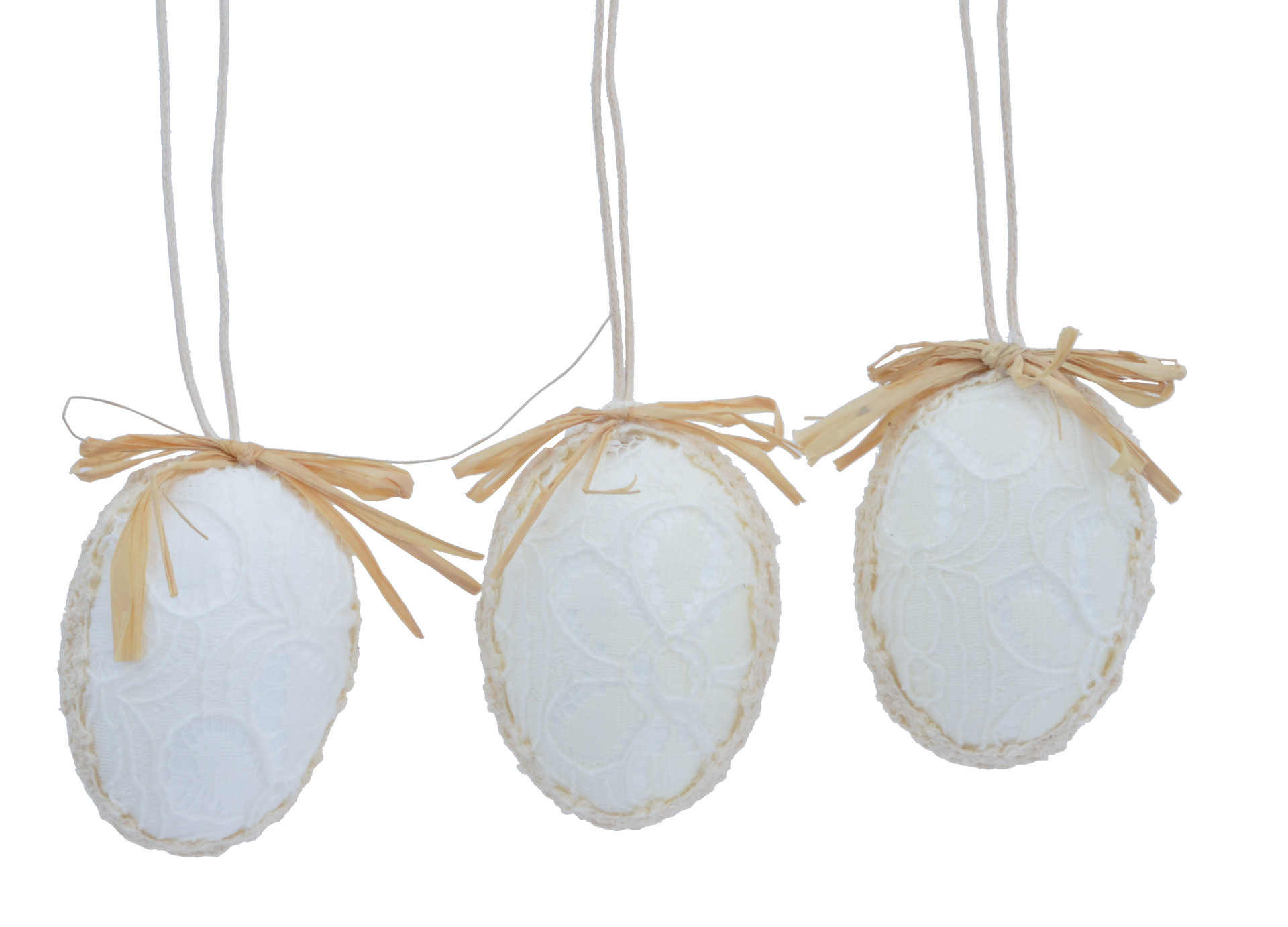 Komplet trzech białych zawieszek KORIDA w kształcie jajek, ozdobionych koronkowym wzorem i przewiązanych naturalnym sznurkiem z kokardką. Idealne do wiosennych dekoracji, szczególnie na Wielkanoc.