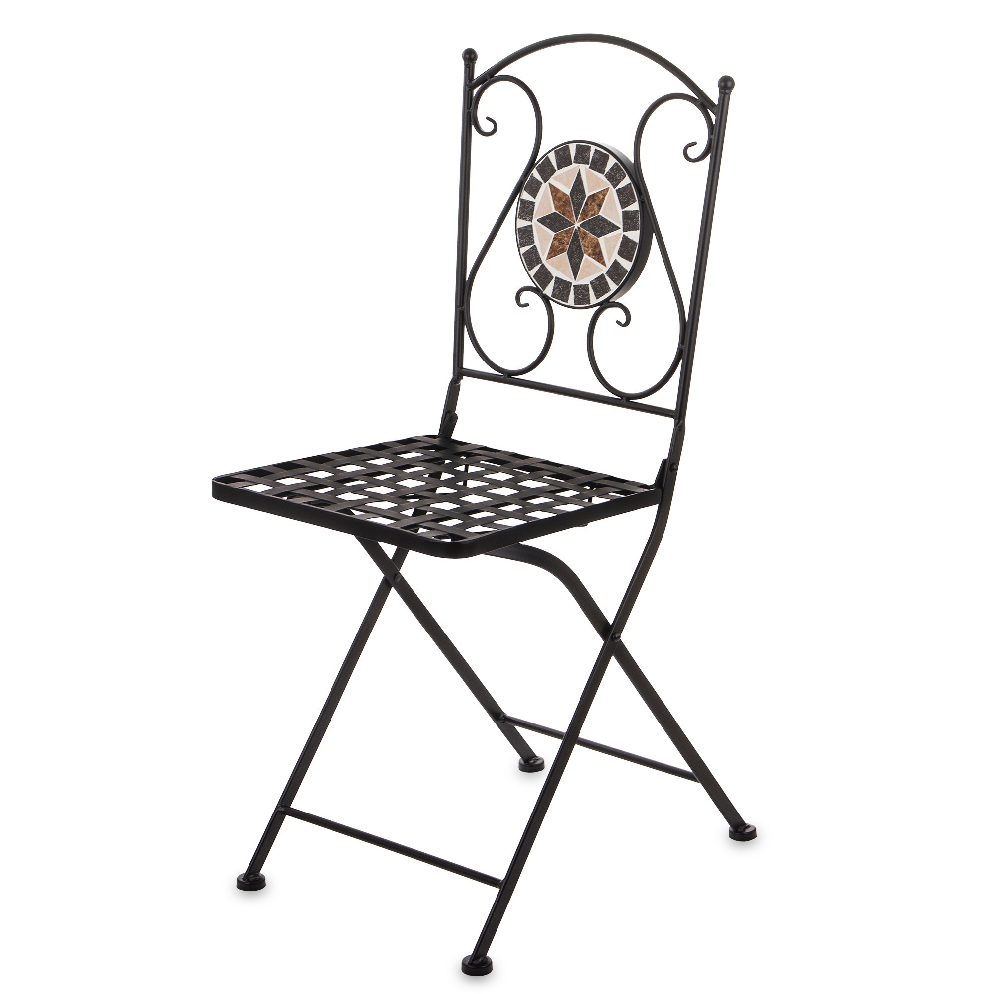 Eleganckie krzesło ogrodowe KAPUZ z mozaikowym wzorem na oparciu. Wykonane z trwałego metalu, idealne do użytku na zewnątrz. Składane, co ułatwia przechowywanie.