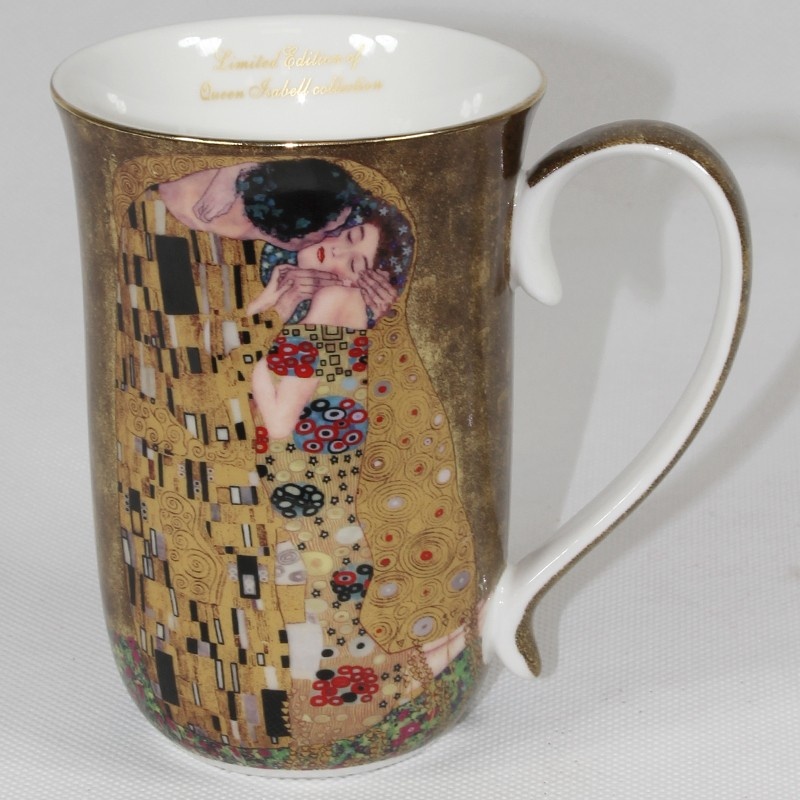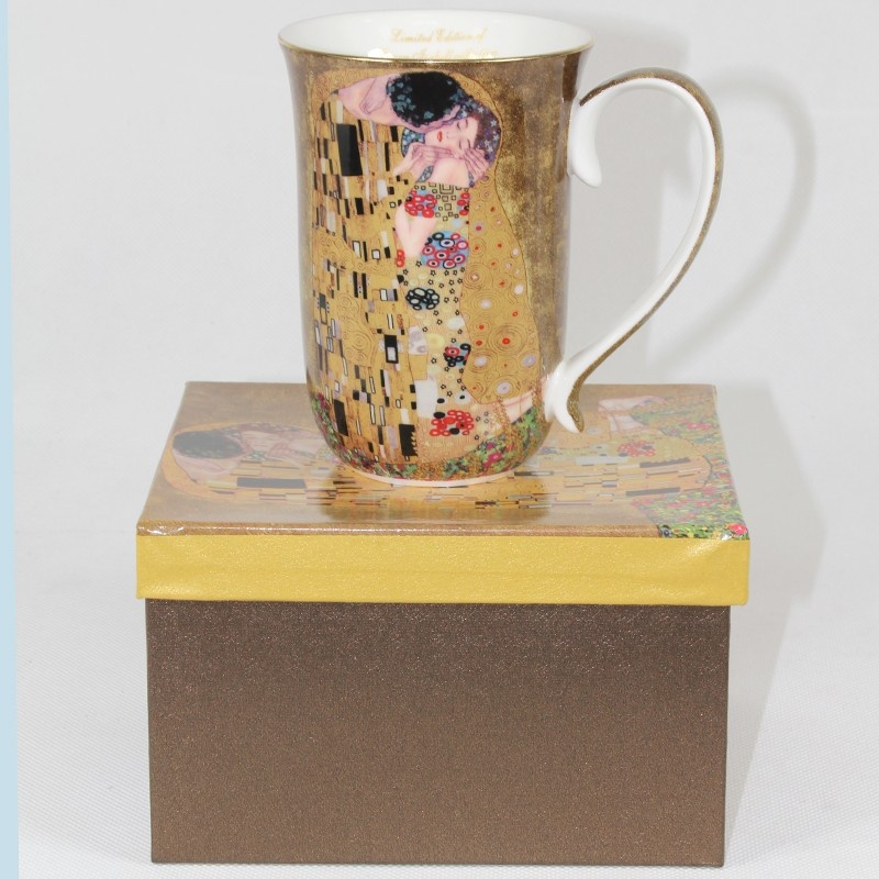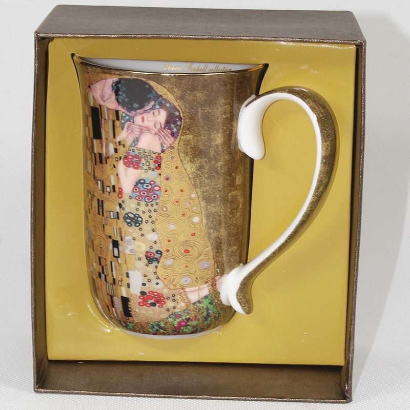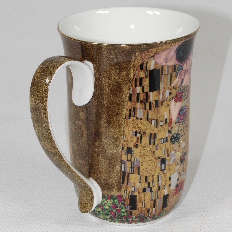 Kubek z reprodukcją ikonicznego obrazu Gustava Klimta „Pocałunek” to wspaniałe dzieło sztuki użytkowej. Wykonany z najwyższej jakości porcelany, zachwyca bogatymi detalami i kolorami, które oddają piękno oryginalnego dzieła. Złote akcenty dodają mu elegancji, czyniąc go nie tylko praktycznym naczyniem, ale także wyjątkowym elementem dekoracyjnym. Idealny na poranną kawę, popołudniową herbatę lub jako unikalny prezent dla miłośnika sztuki. Dzięki połączeniu klasycznego wzoru i funkcjonalności, kubek ten staje się wyrazem dobrego smaku i pasji do piękna.