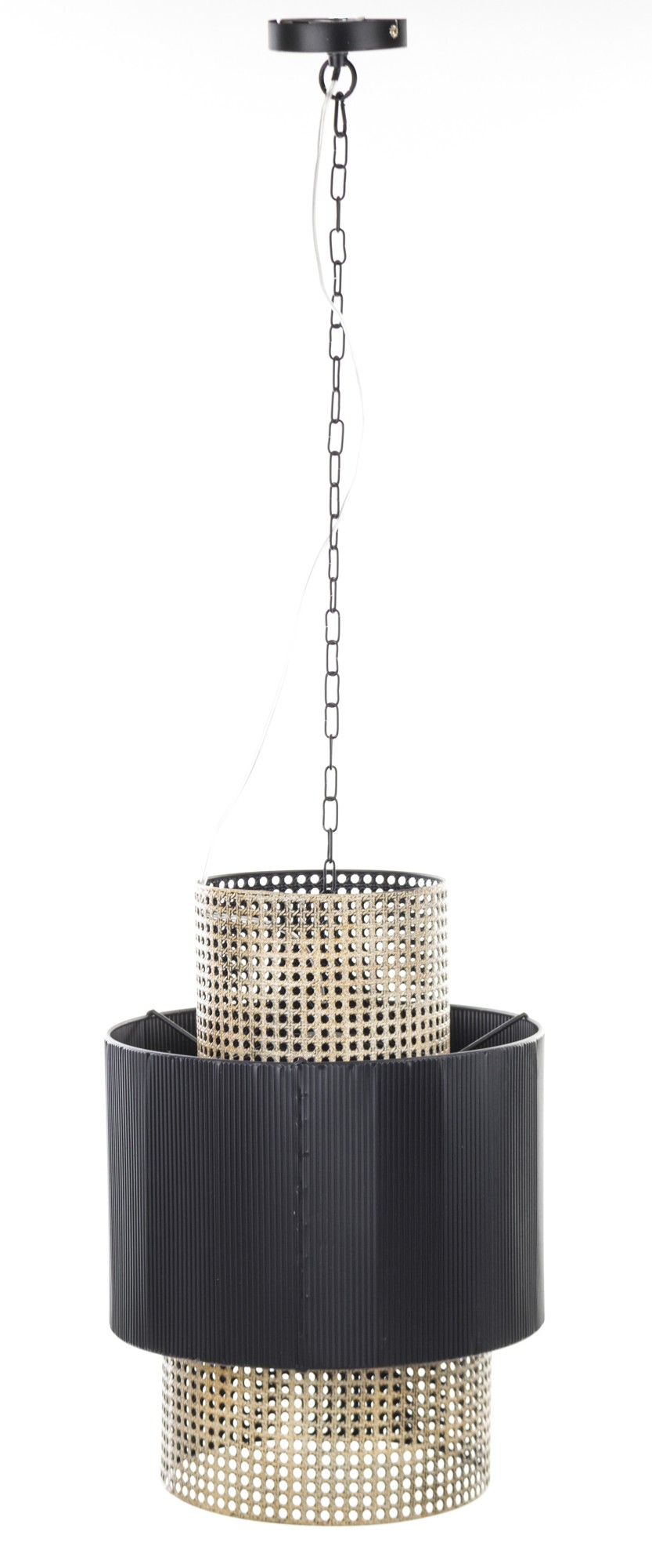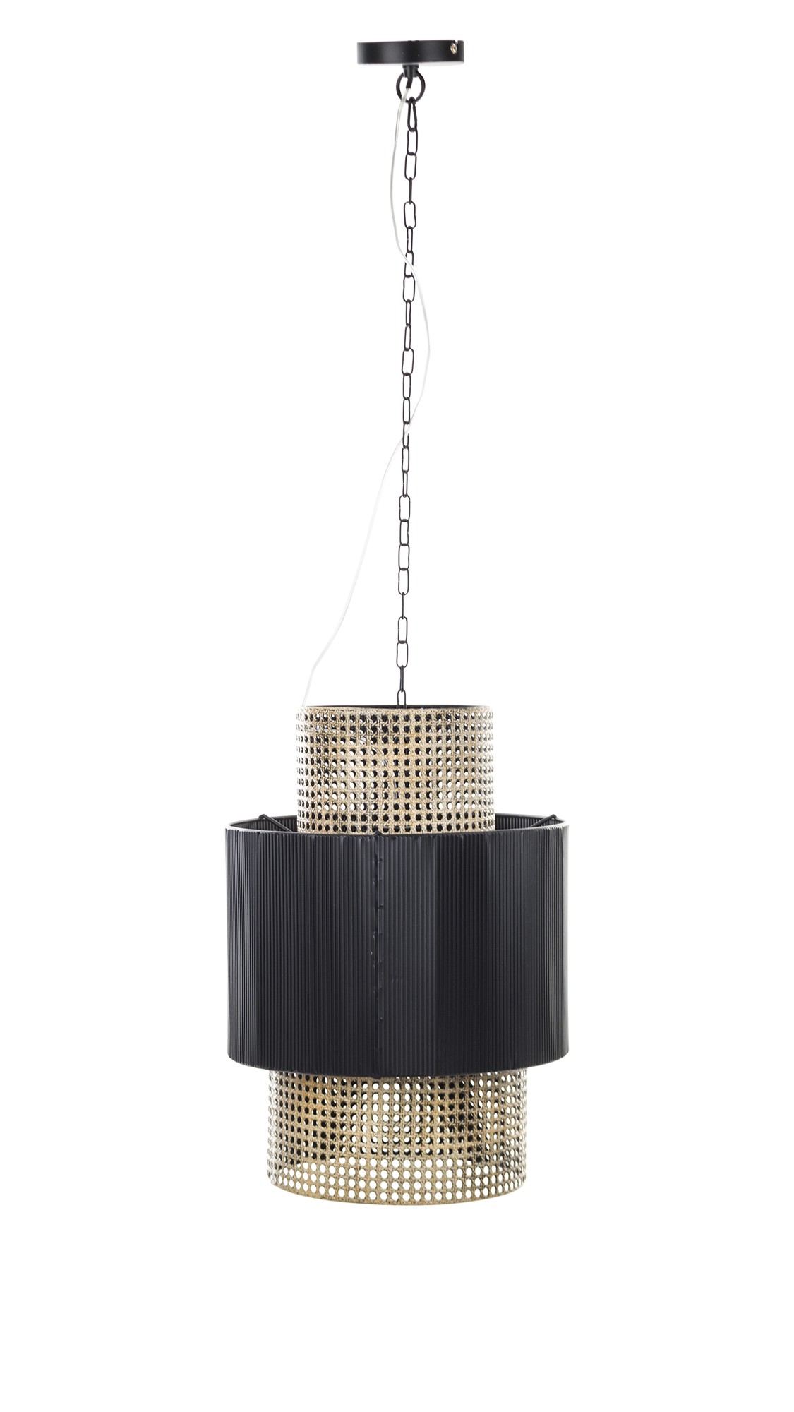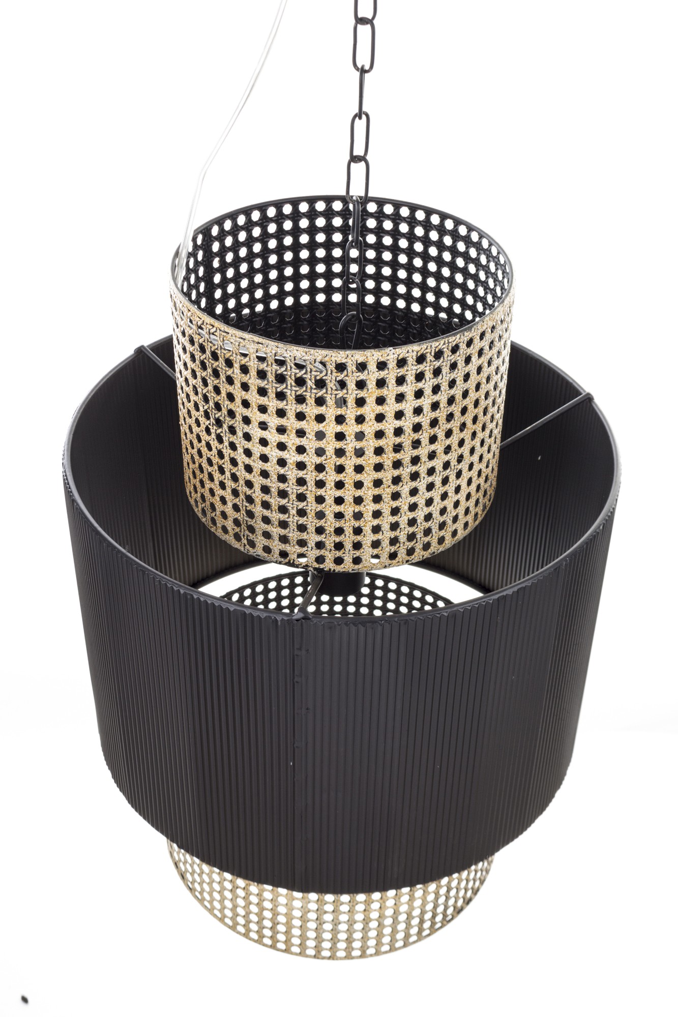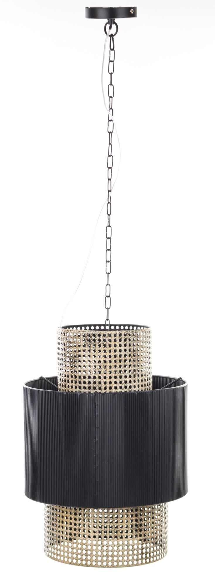 Wyjątkowa lampa wisząca z metalu. Lampa wygląda jakby składała się z trzech abażurów różnej wielkości: dwóch z siatki w kolorze starego złota i środkowego w kolorze czarnym. Ta elegancka lampa wspaniale rozprasza światło i dodaje charakteru każdemu pomieszczeniu.