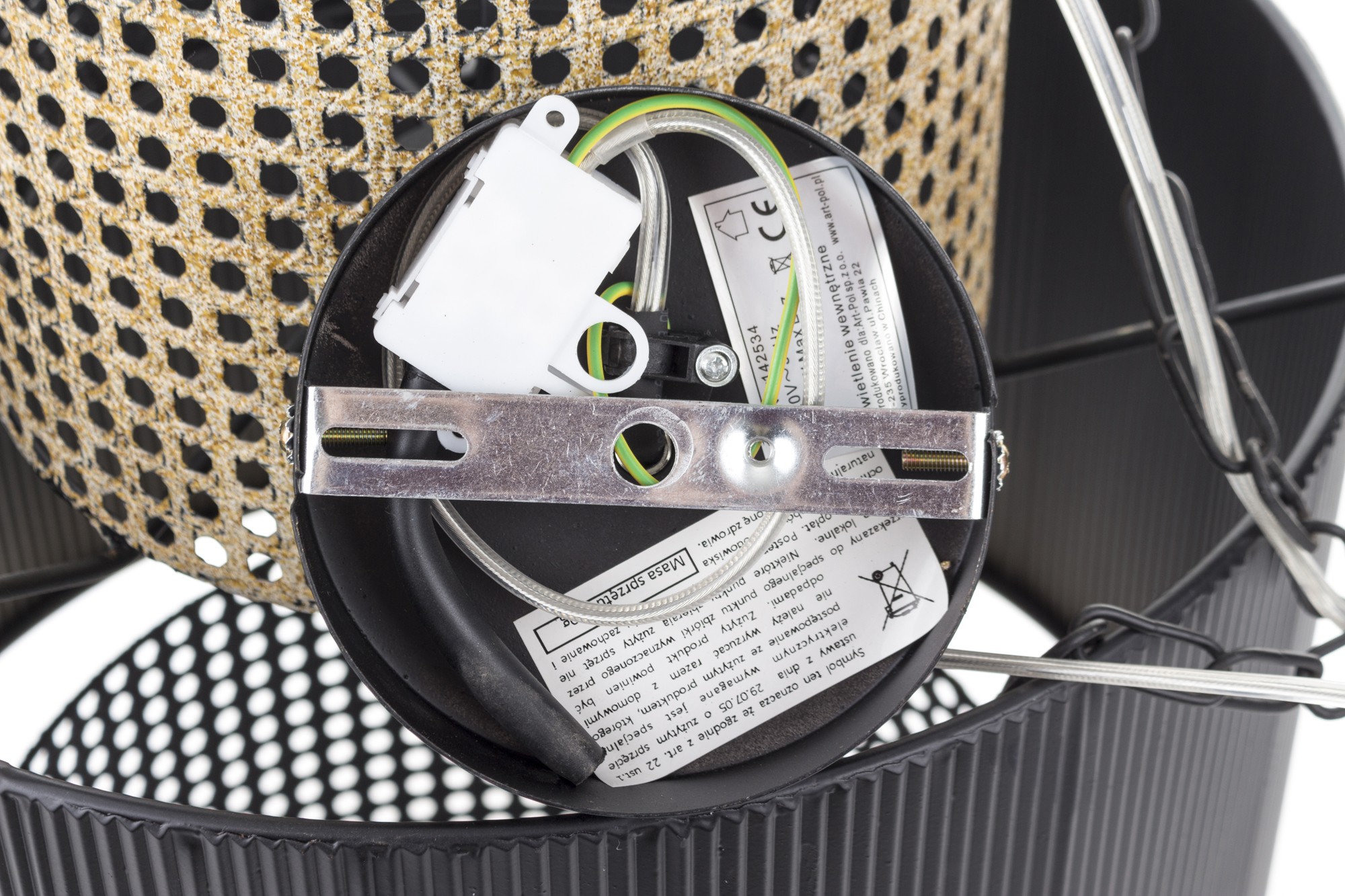Stylowa lampa wisząca będąca połączeniem elegancji i nowoczesnego designu. Składa się z trzech abażurów: górny i dolny to delikatna siatka w kolorze starego złota, a środkowy panel jest czarny, co tworzy wyjątkowy kontrast. Ta lampa doskonale wpisuje się w różne aranżacje wnętrz. Idealna do salonu, jadalni czy sypialni, gdzie stanie się nie tylko źródłem światła, ale i niezwykłą ozdobą. Dzięki wyjątkowej konstrukcji oraz użytym materiałom będzie pięknie rozpraszać światło tworząc niepowtarzalny klimat.