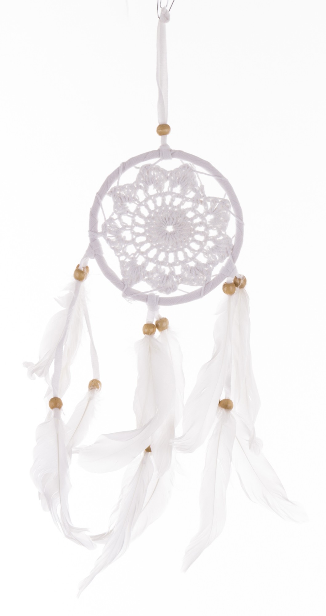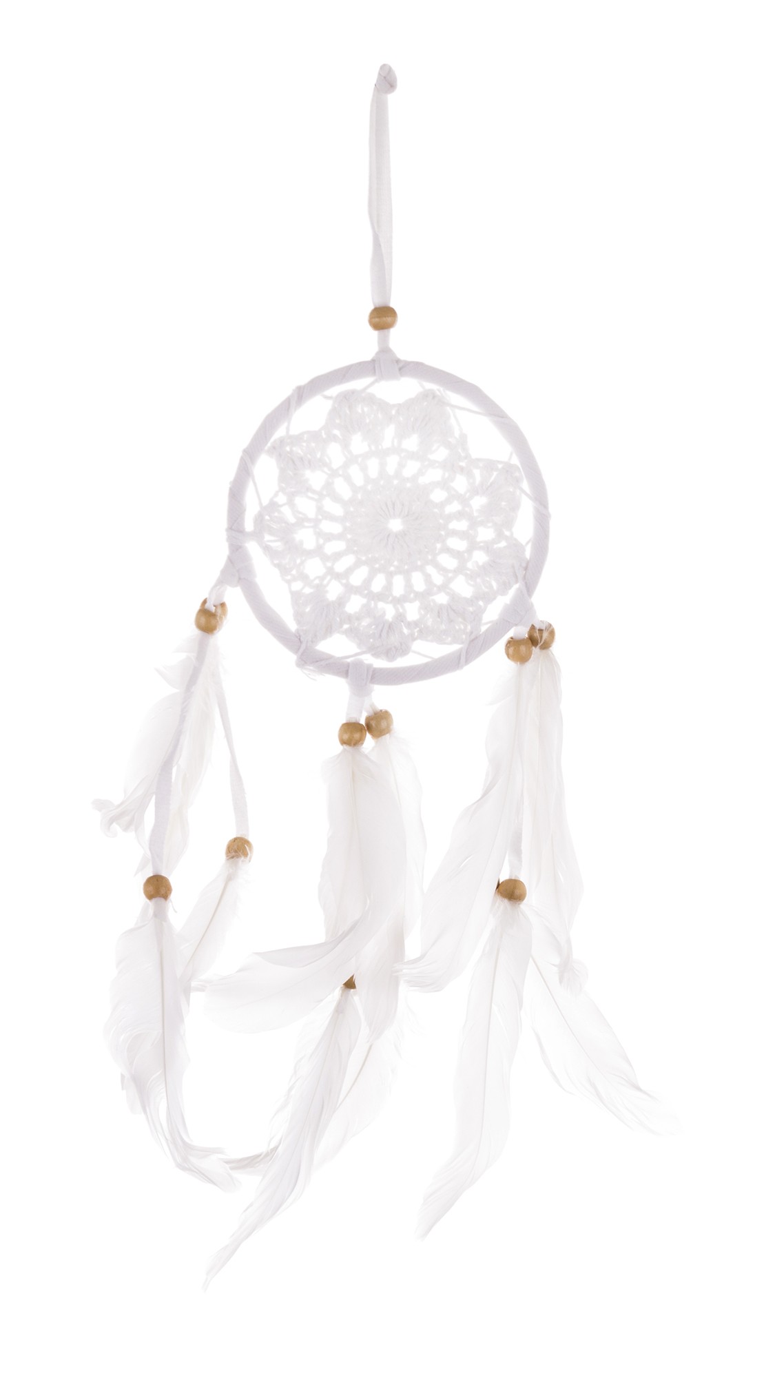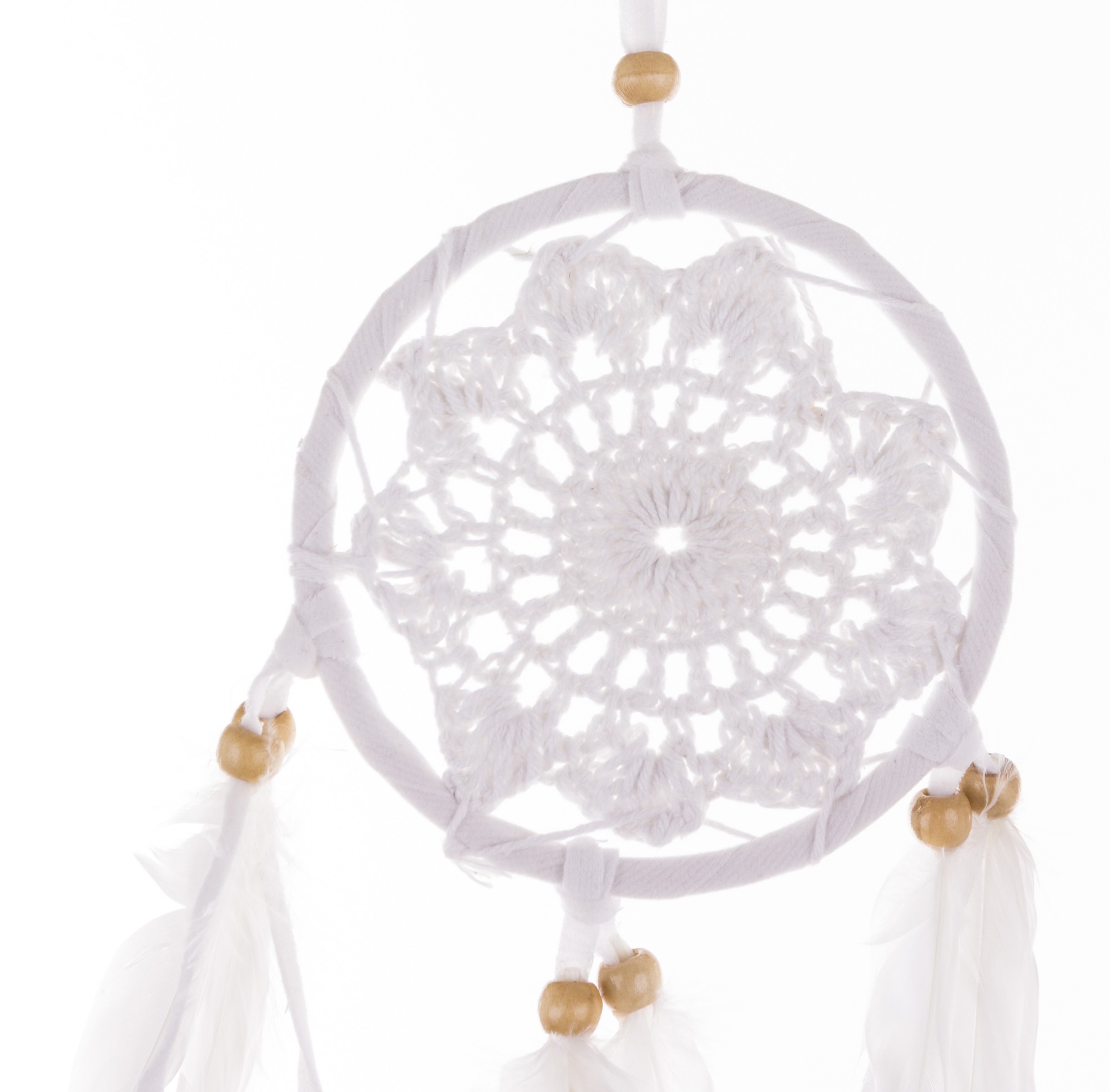 Biały łapacz snów to delikatna i romantyczna dekoracja, która wprowadzi do Twojego wnętrza nutę sielankowego uroku. W okrągłą obręcz wpleciony jest gwieździsty wzór z koronki, który dodaje mu elegancji i lekkości. Z łapacza snów zwisają pióra przeplecione koralikami, tworząc subtelny i estetyczny efekt. To idealny wybór dla miłośników wyrafinowanej dekoracji i subtelności, poszukujących elementu o symbolicznym znaczeniu.