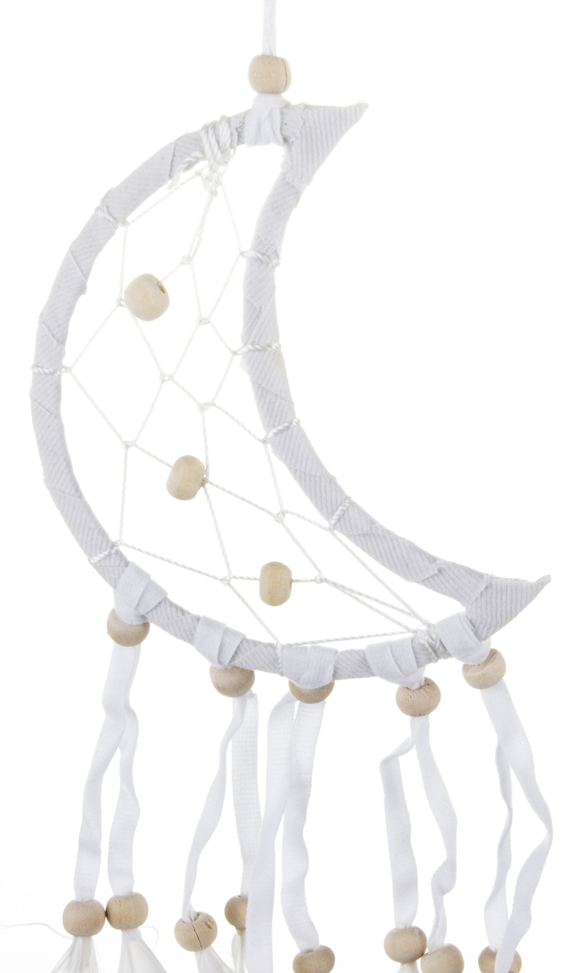 Ten piękny łapacz snów w kształcie księżyca oplatanego białą bawełnianą nicią przyciąga wzrok delikatną koronką w środku. Wplecione koraliki dodają mu elegancji, a opadające sznurki zdobione piórami tworzą niezwykły efekt wizualny. To idealny dodatek do każdej sypialni, który wprowadzi spokój i harmonię. Zadbaj o swoje sny dzięki temu magicznemu amuletowi.
