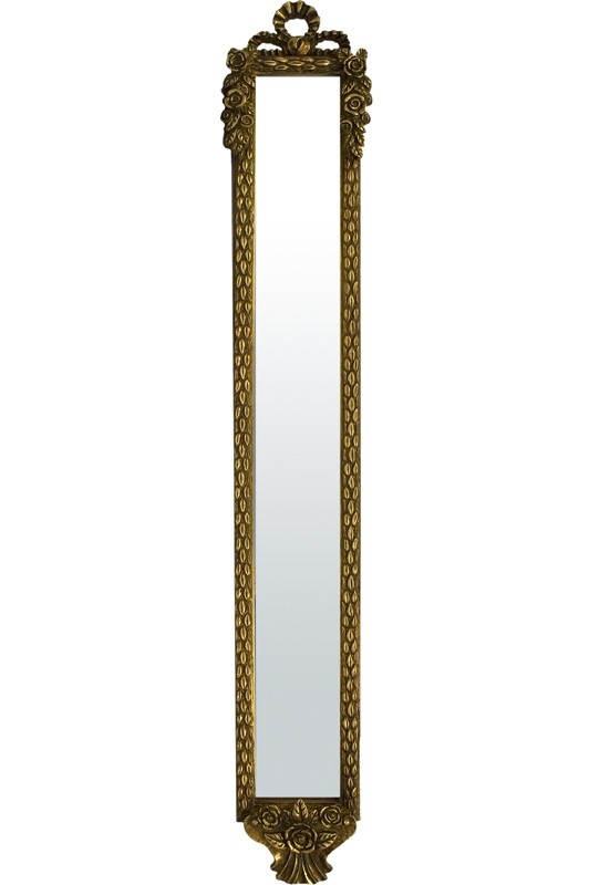 Eleganckie prostokątne lustro w drewnianej, pozłacanej ramie z finezyjnym wykończeniem na górnej krawędzi. Rama zdobiona jest pięknymi motywami roślinnymi, co nadaje mu wyjątkowy charakter. Lustro o wymiarach 131x21x5 cm idealnie wpasuje się do każdego wnętrza, dodając mu elegancji.