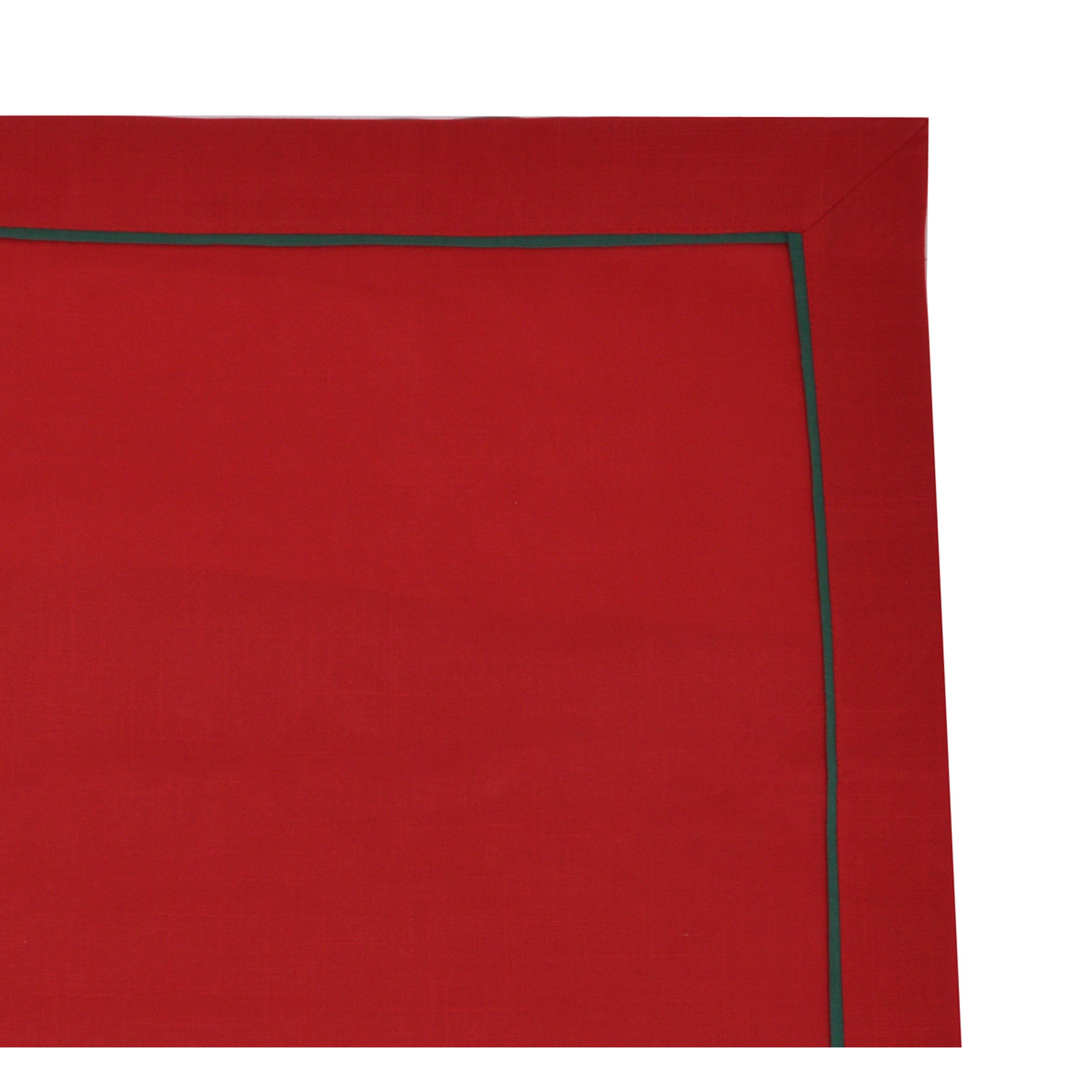 Obrus czerwony z zieloną oblamówką o wymiarach 140×220 cm to efektowny element dekoracyjny, który doskonale nadaje się do udekorowania stołu podczas świąt Bożego Narodzenia. Połączenie klasycznego czerwonego koloru, który symbolizuje miłość i ciepło świąt, z zieloną oblamówką, przypominającą kształtem choinkę, tworzy idealny klimat świąteczny.