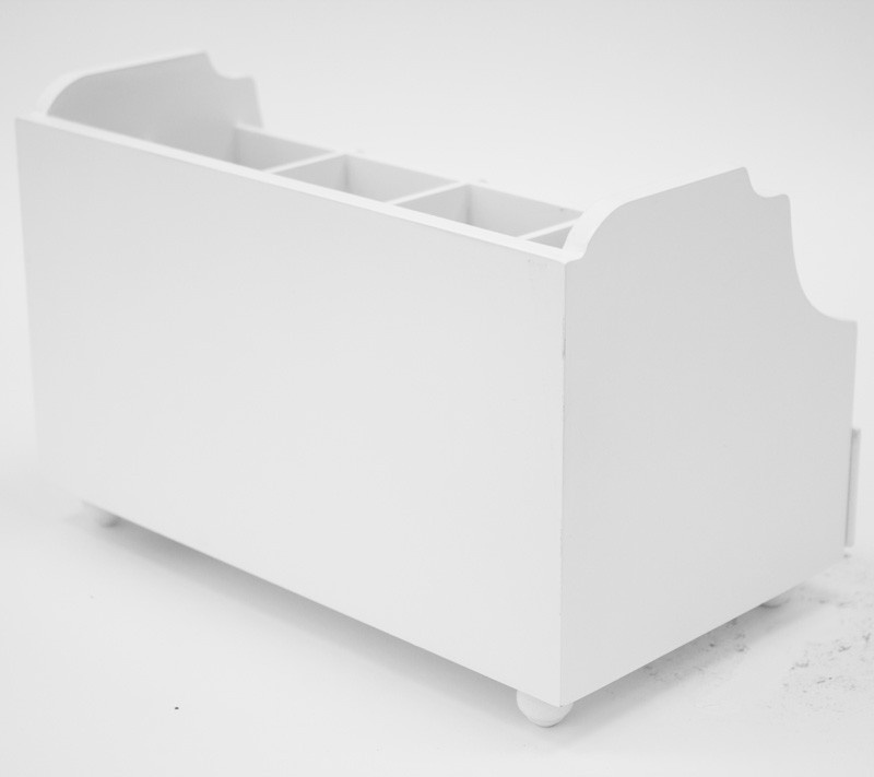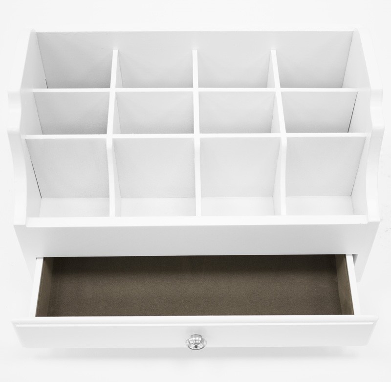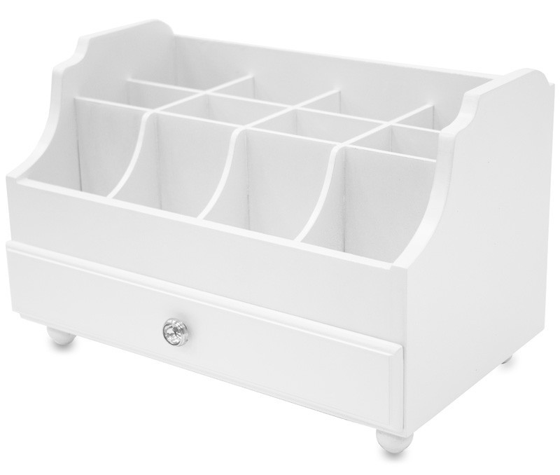 Biały drewniany organizer to stylowe i praktyczne rozwiązanie do przechowywania biżuterii, kosmetyków lub artykułów biurowych. Wyposażony w jedną szufladę oraz otwartą przestrzeń podzieloną na mniejsze części, pomaga utrzymać porządek na biurku lub toaletce. Elegancki design sprawia, że pasuje do każdego wnętrza.