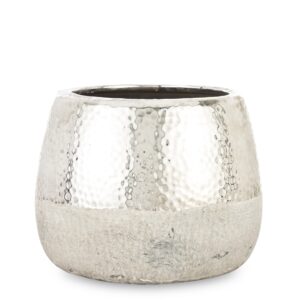 Okrągła kamionkowa osłonka na donicę o średnicy 14,5 cm w złoto-czarnym kolorze to wyjątkowy element dekoracyjny, który wprowadza elegancję do każdego wnętrza. Jej młotkowana, błyszcząca powierzchnia przyciąga wzrok i nadaje luksusowego wyglądu. Wyraźnie zaznaczony ozdobny rant dodaje subtelnego uroku, tworząc niepowtarzalny akcent. Wykonana z wysokiej jakości kamionki, osłonka charakteryzuje się trwałością i odpornością na uszkodzenia, gwarantując długotrwałe użytkowanie. Złoto-czarna kolorystyka doskonale współgra z różnorodnymi stylami wnętrzarskimi, dodając blasku i wyrafinowania. Osłonka będzie idealna do eksponowania małych roślin, podkreślając ich naturalne piękno i dodając wyjątkowego uroku każdemu pomieszczeniu. To praktyczny i stylowy dodatek, który doda wyjątkowego charakteru każdemu wnętrzu.