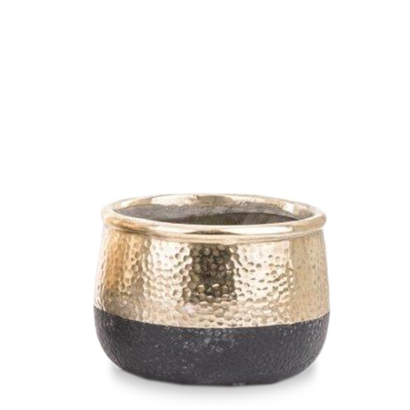 Okrągła kamionkowa osłonka na donicę o średnicy 14,5 cm w złoto-czarnym kolorze to elegancki i nowoczesny dodatek do wnętrza. Jej młotkowana, błyszcząca powierzchnia przyciąga wzrok, a wyraźnie zaznaczony ozdobny rant dodaje wyjątkowego charakteru. Idealna do eksponowania małych roślin, podkreślając ich piękno i styl. Wykonana z trwałej kamionki, zapewnia długotrwałe użytkowanie.