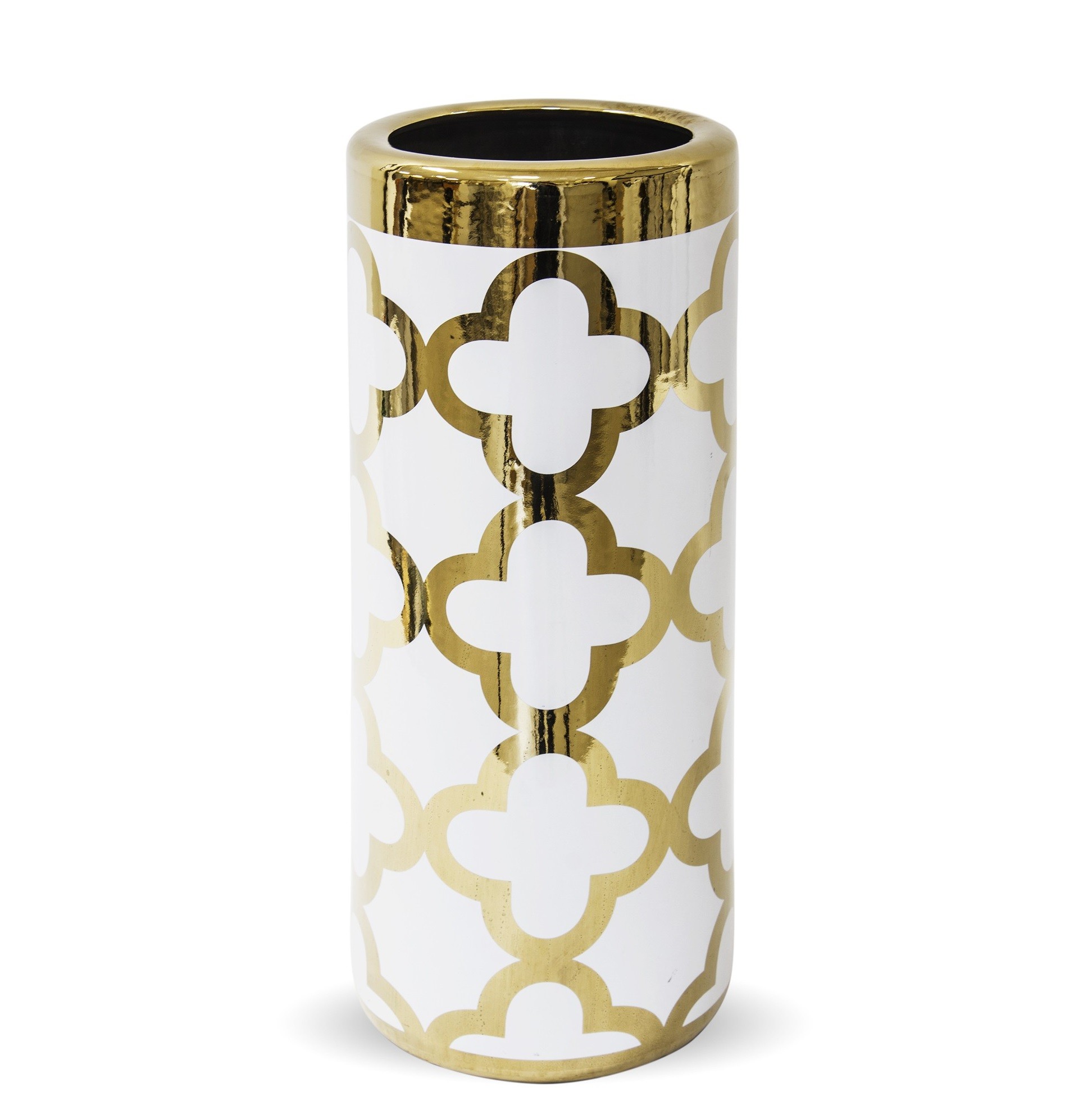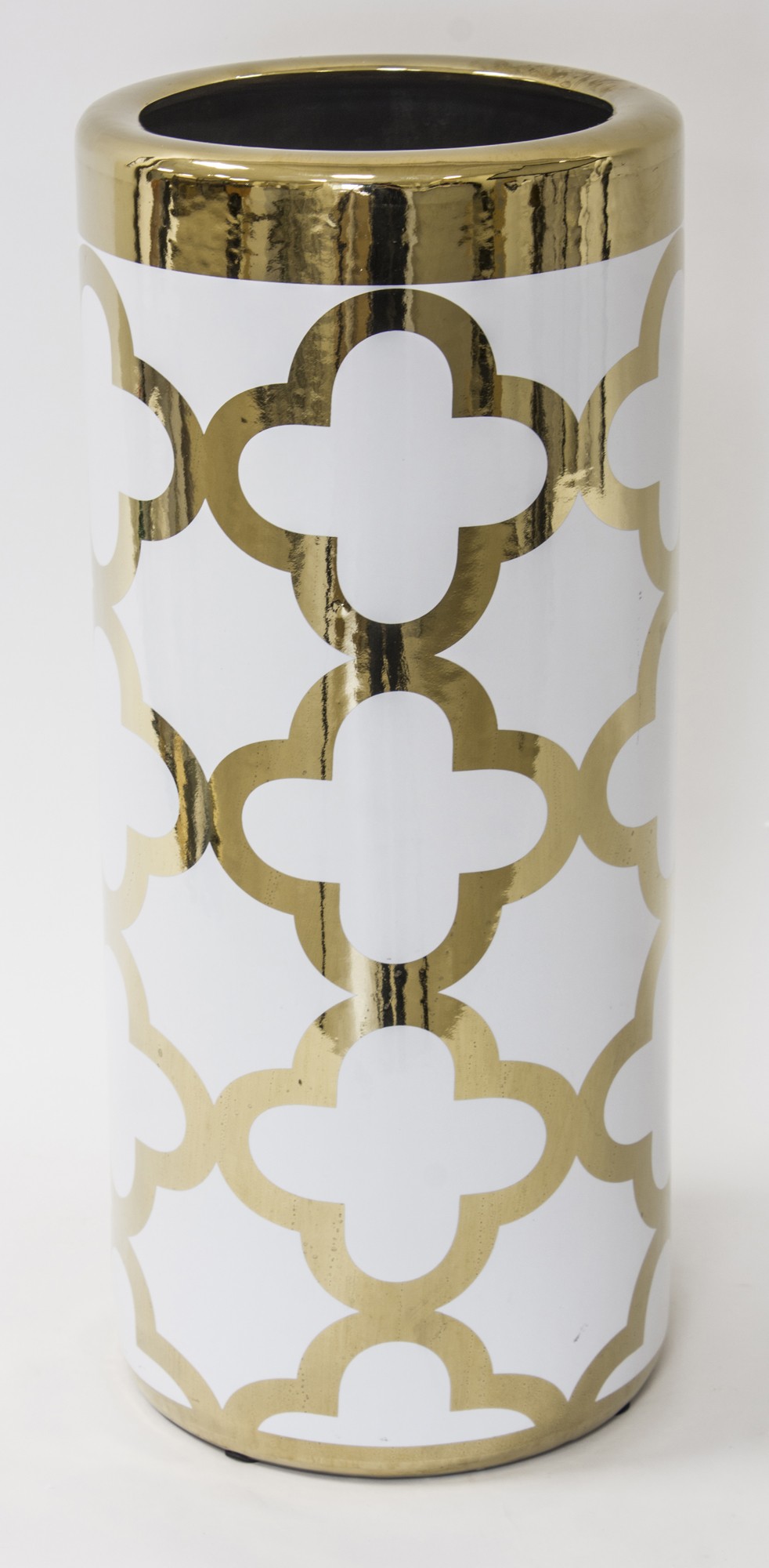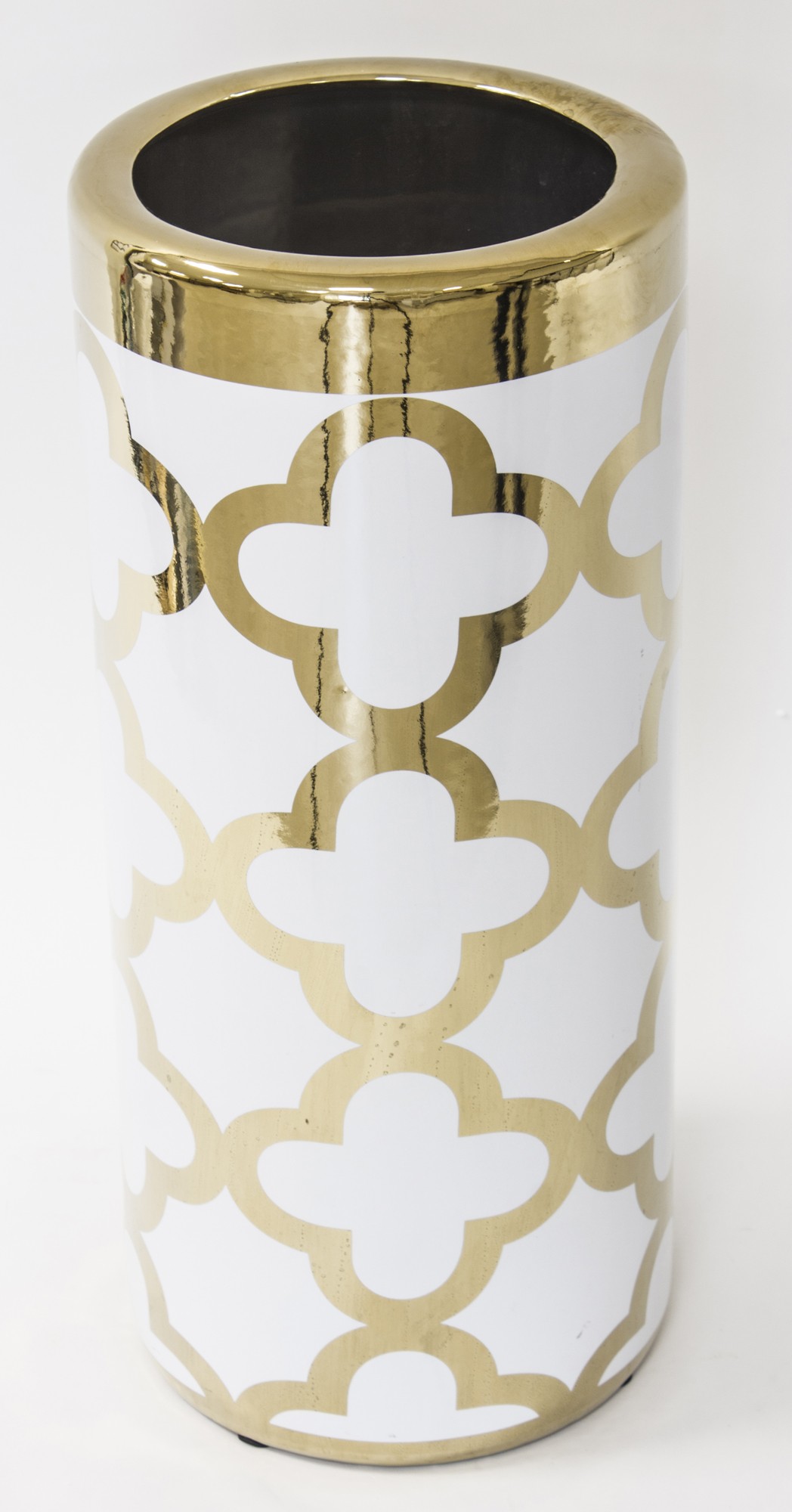 Nasz Parasolnik Złota Elegancja to połączenie funkcjonalności z wysokim poziomem estetyki. Wykonany z ceramiki, prezentuje się wyjątkowo szykownie dzięki złotym wzorom na białym tle. Solidna konstrukcja zapewnia stabilność, a ergonomiczny kształt wygodę przechowywania. Dodaj odrobinę klasy do swojego wnętrza dzięki stojakowi na parasole Złota Elegancja.