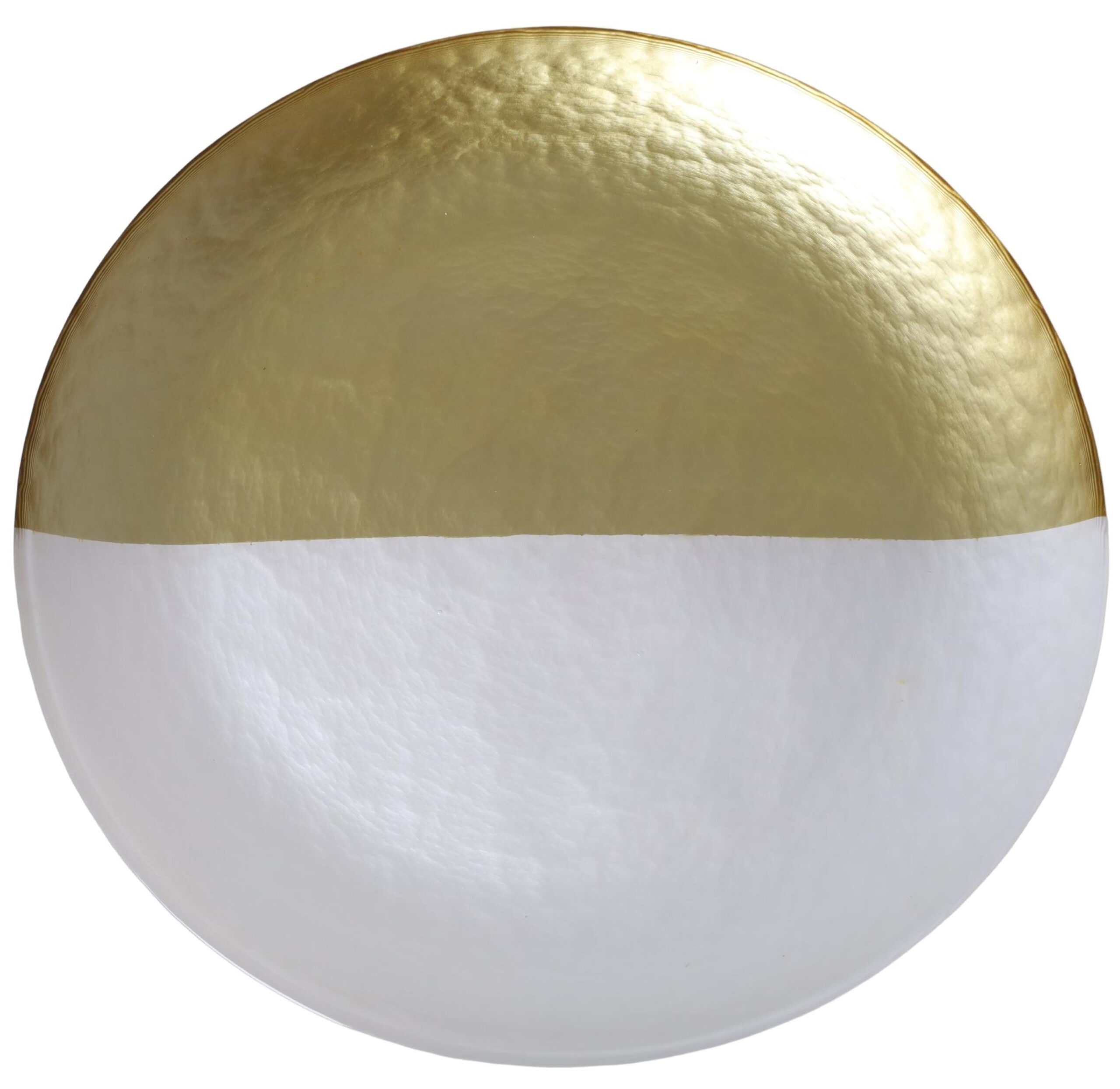 Podtalerz szklany DALO w kolorze biało-złotym. Górna część podtalerza jest złota, a dolna biała, co nadaje mu elegancki i nowoczesny wygląd. Idealny do dekoracji stołu na specjalne okazje.