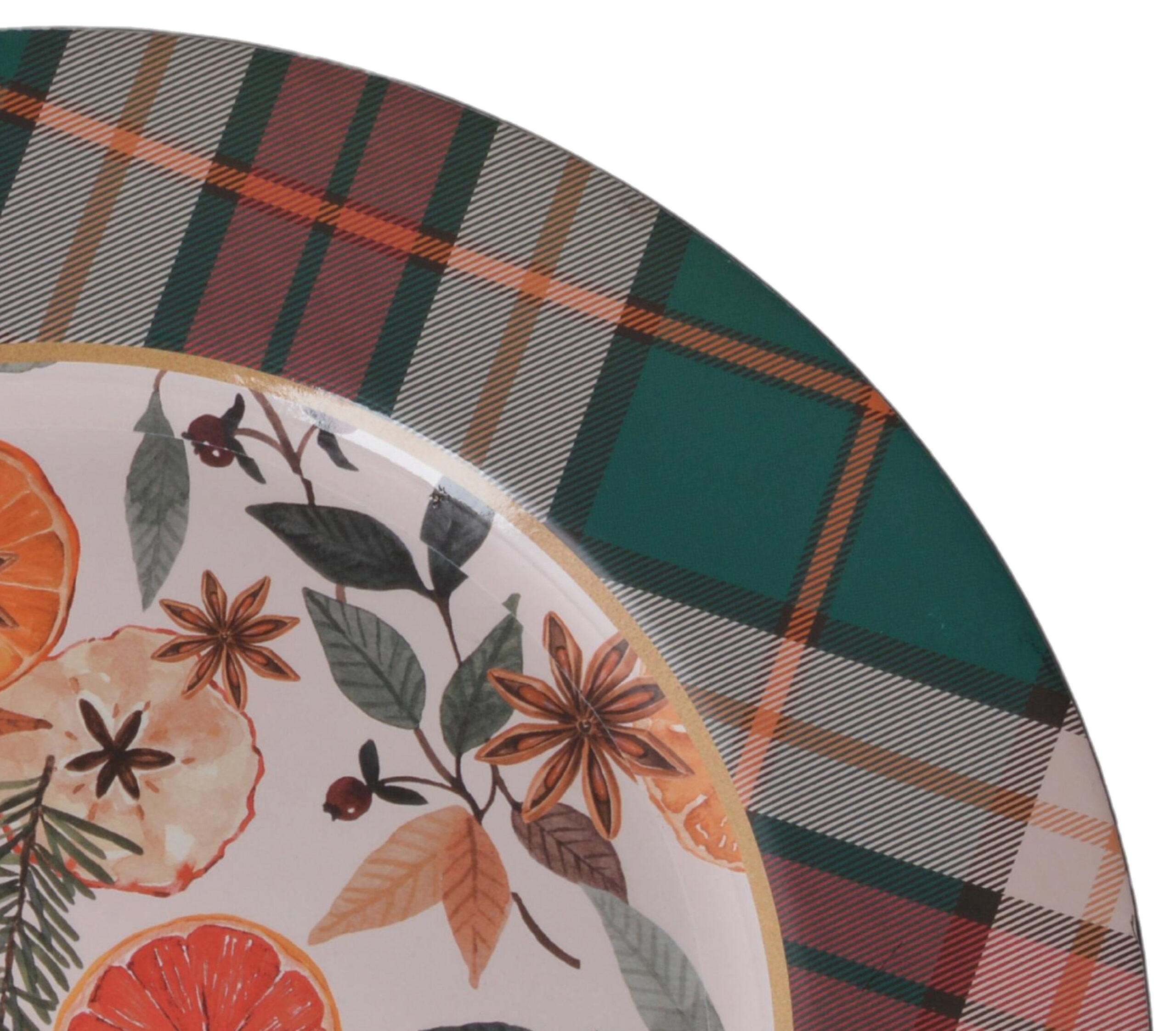 Podtalerz MARIE z owocami to elegancki element dekoracyjny, który doda uroku każdemu stołowi. Podtalerz ma wzór w kratę w odcieniach zieleni, czerwieni i beżu, co nadaje mu klasyczny wygląd. Na środku podtalerza znajduje się piękny motyw owoców i liści w odcieniach pomarańczowego, zielonego i brązowego. Wzór przedstawia różnorodne owoce, takie jak pomarańcze i gwiazdy anyżu, otoczone liśćmi i gałązkami. Ten podtalerz jest idealny na specjalne okazje, takie jak święta, uroczyste kolacje czy spotkania rodzinne, dodając elegancji i stylu każdemu nakryciu stołu.