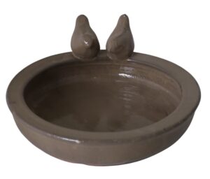 Ceramiczne poidełko TOLL w beżowym kolorze, ozdobione dwiema figurkami ptaszków na krawędzi. Idealne do dekoracji ogrodu i wnętrz, zapewniając funkcjonalność i estetykę.
