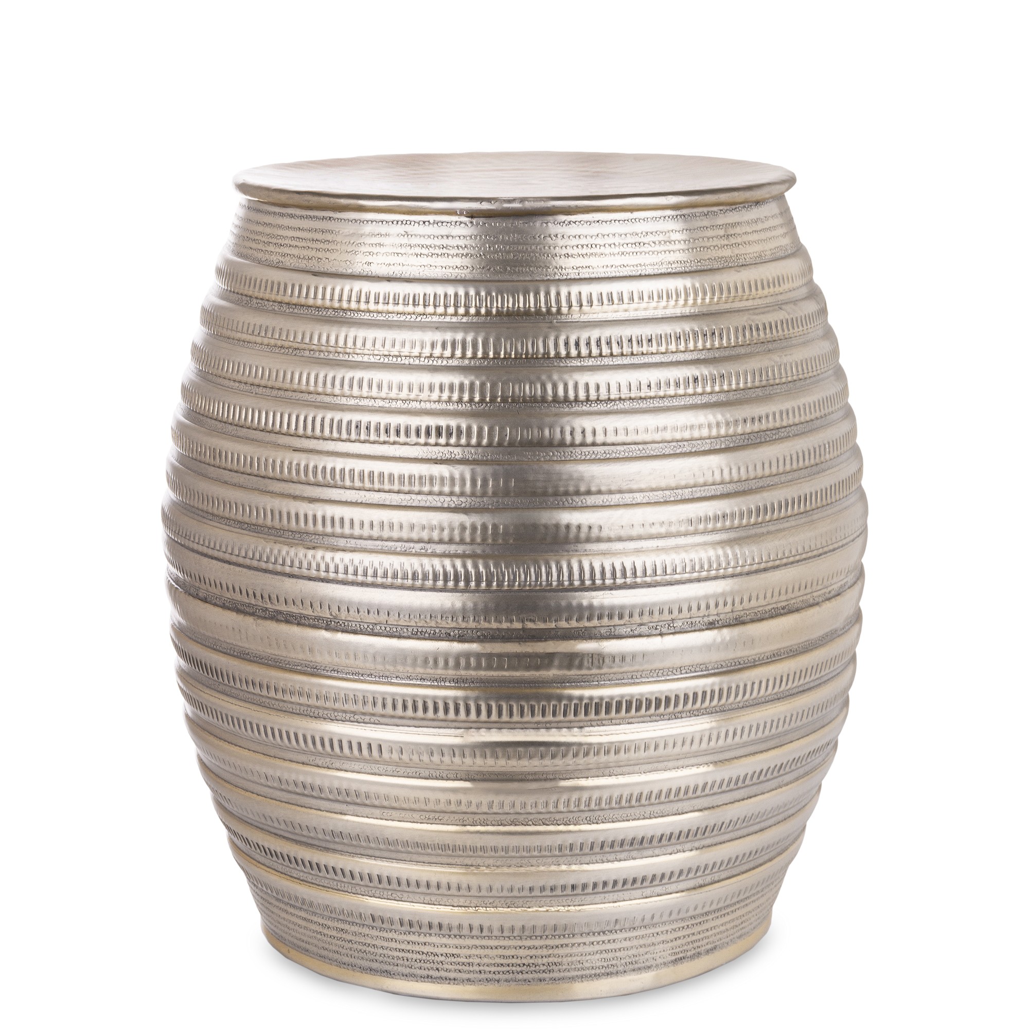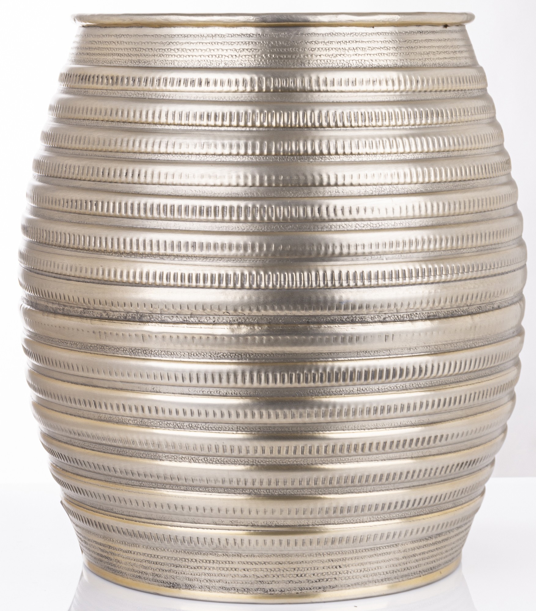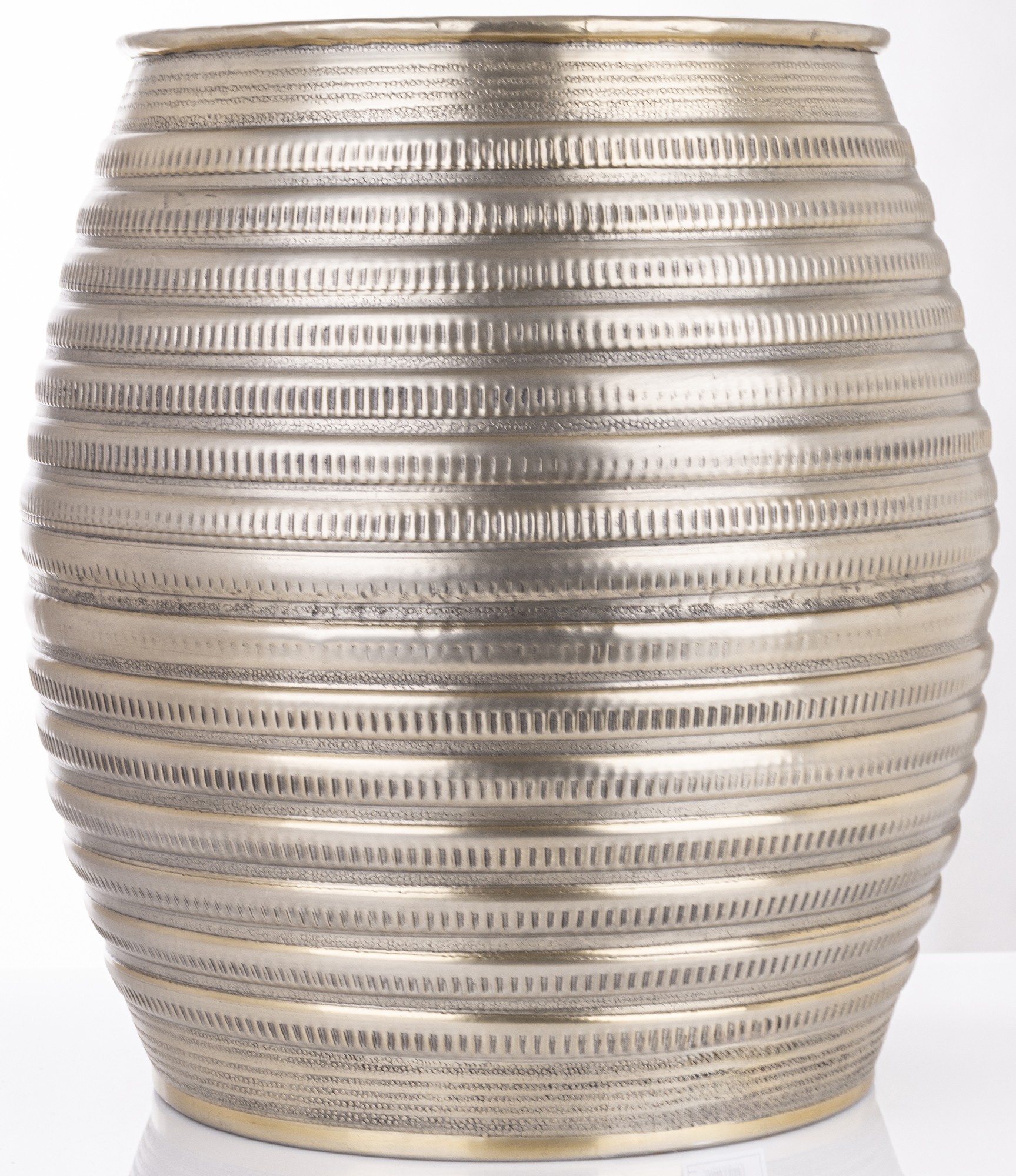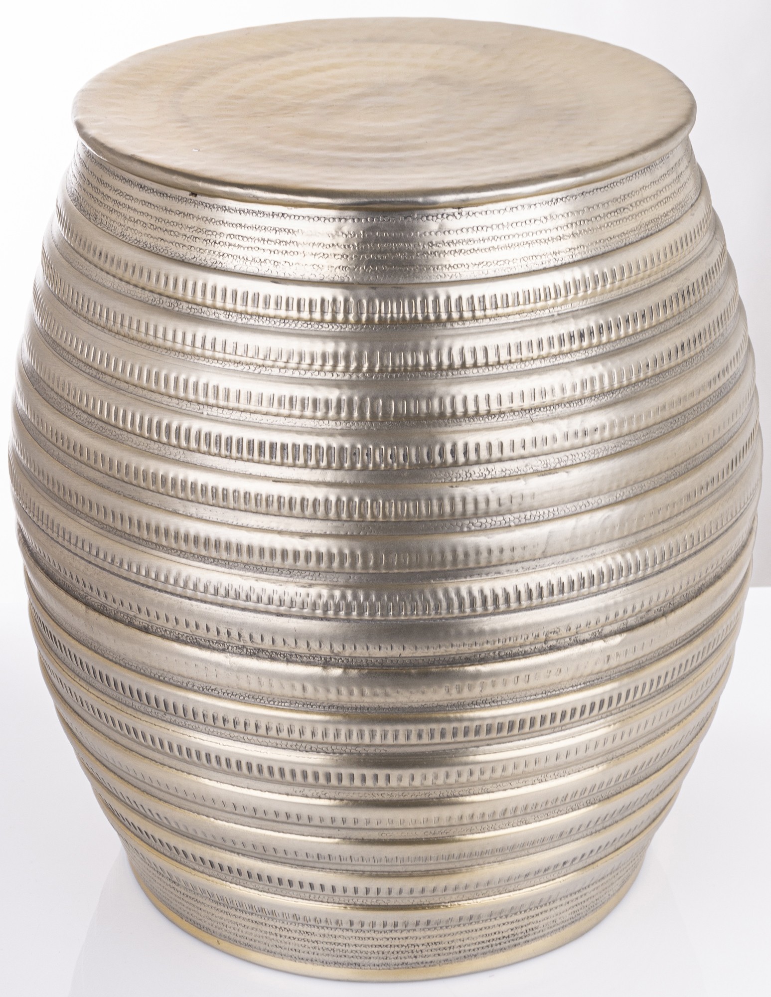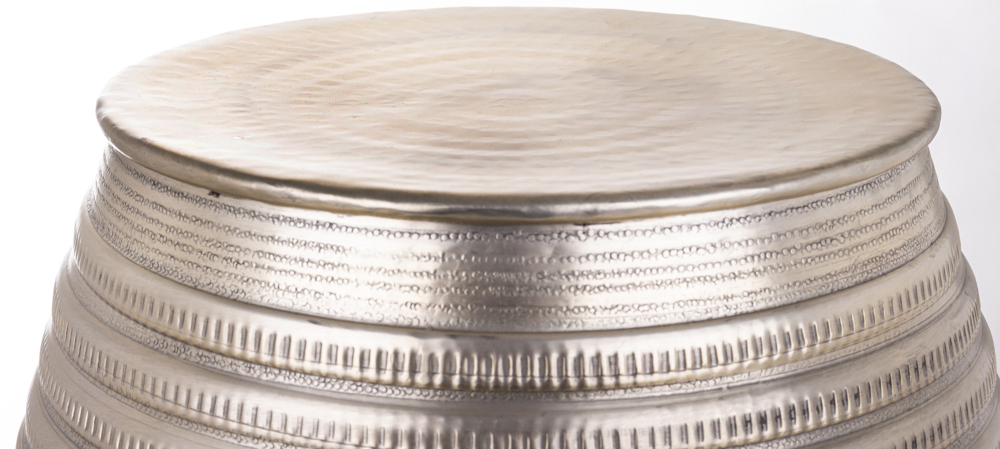 Stolik SIDRUN to elegancki, okrągły stolik kawowy wykonany z metalu w srebrnym kolorze. Jego powierzchnia jest gładka, a boki zdobione są delikatnymi, poziomymi żłobieniami, które nadają mu nowoczesny i stylowy wygląd. Idealny do salonu lub przestrzeni wypoczynkowej.