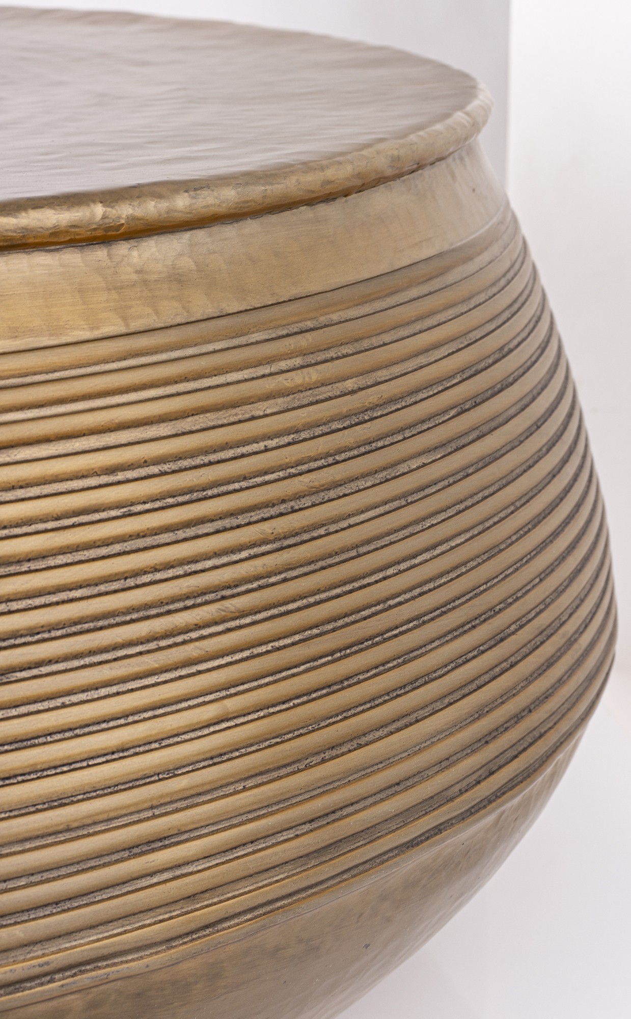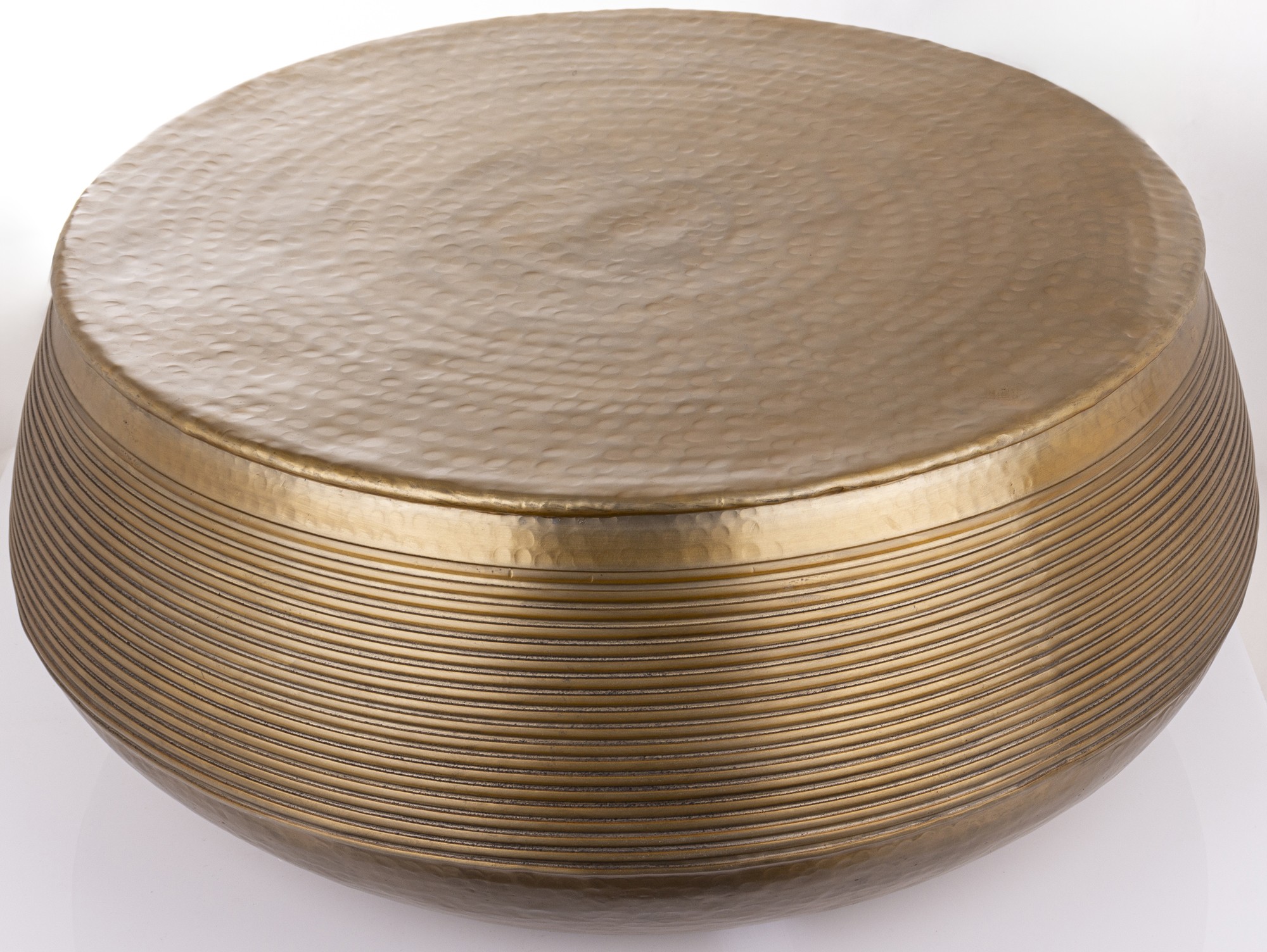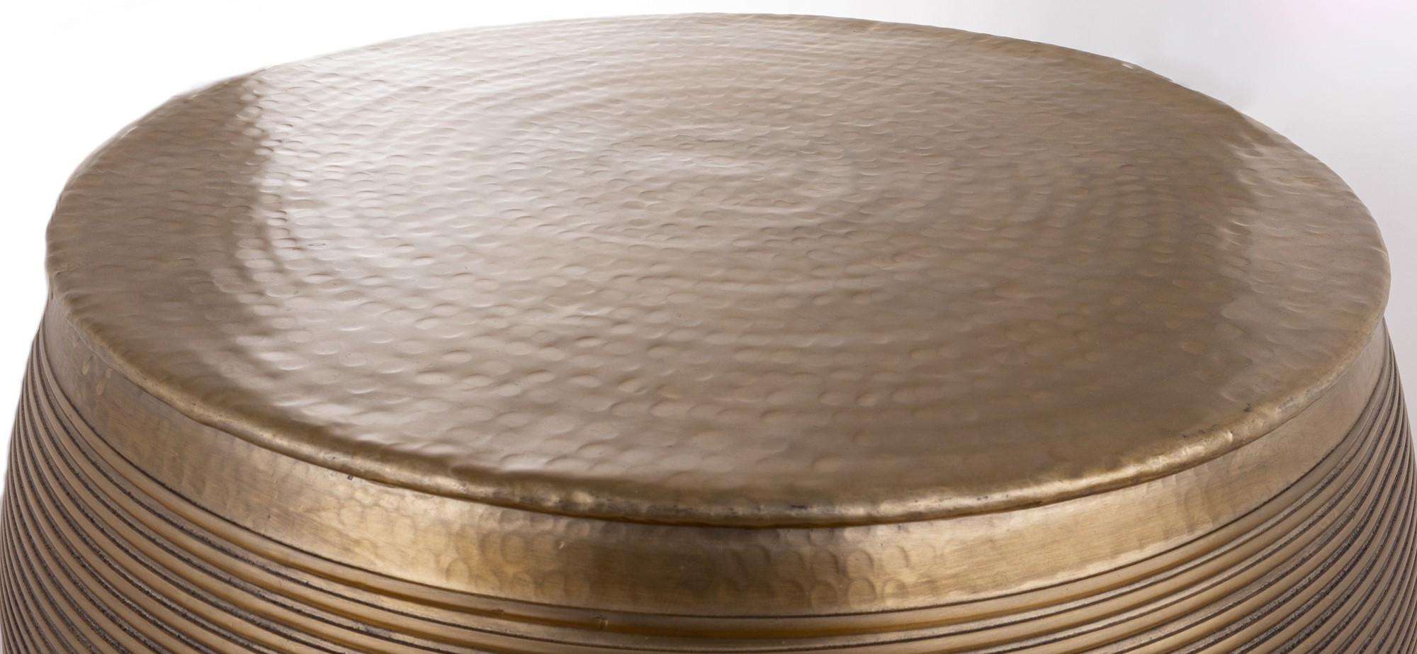 Stolik SITRU to elegancki, okrągły stolik wykonany z metalu w złotym kolorze. Jego powierzchnia jest delikatnie młotkowana, a boczne ściany ozdobione poziomymi żłobieniami, które nadają mu nowoczesny i stylowy wygląd. Idealny do salonu.