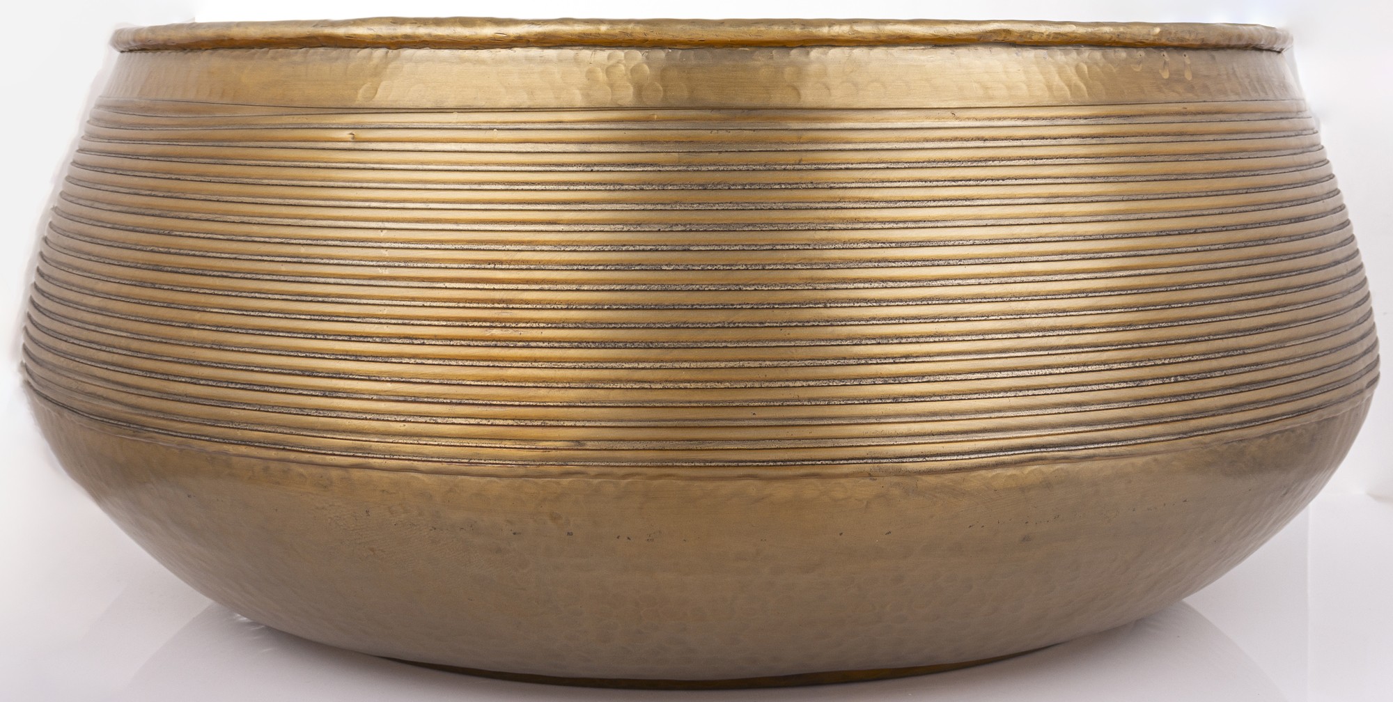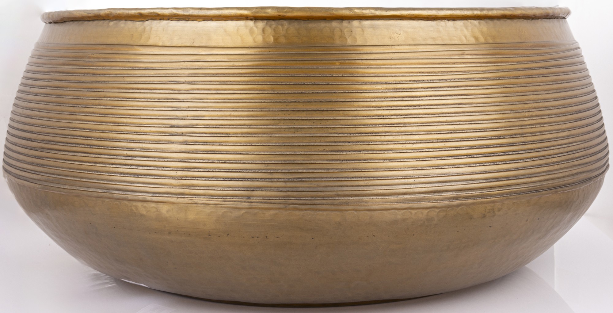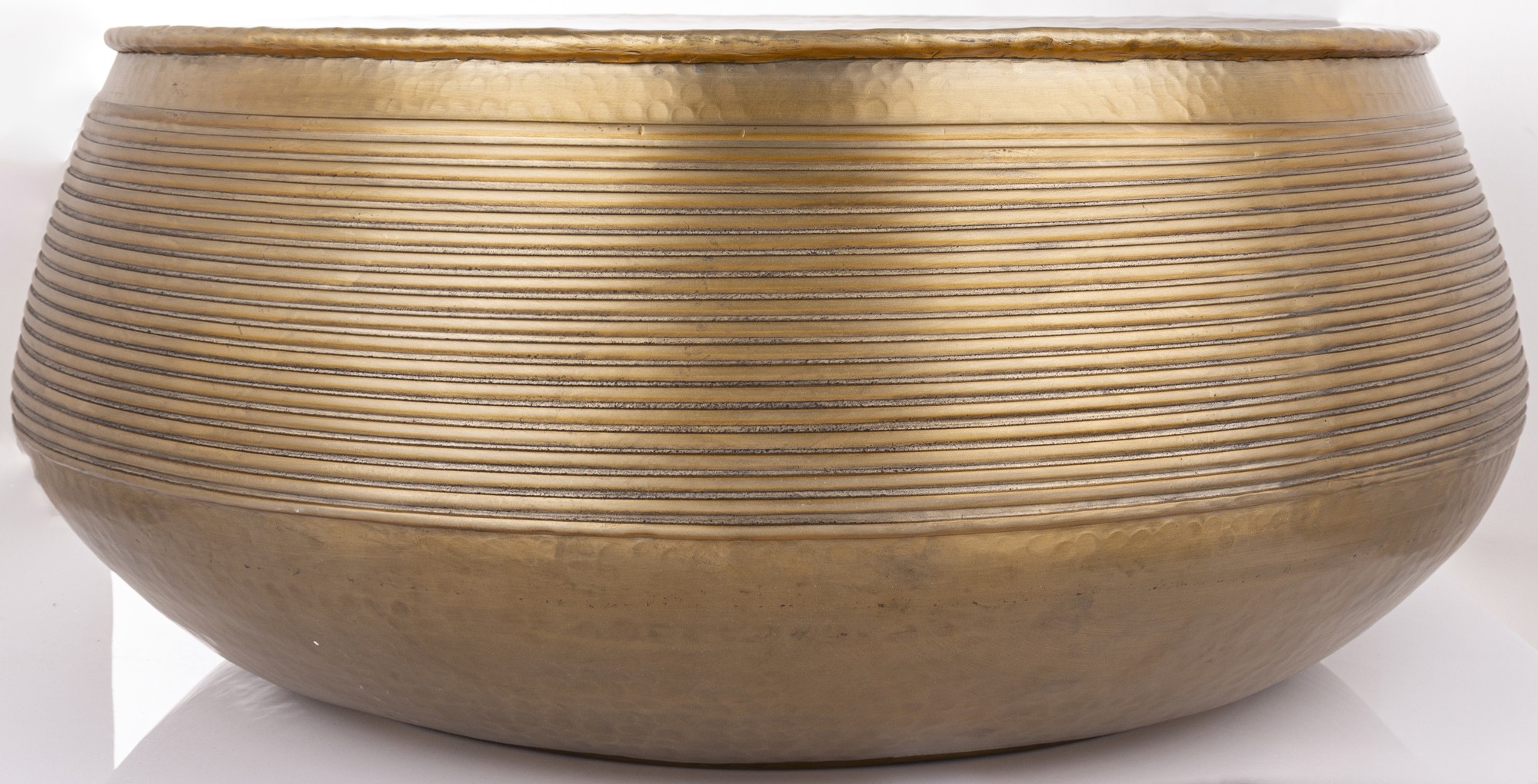Stolik SITRU to elegancki, okrągły stolik wykonany z metalu w złotym kolorze. Jego powierzchnia jest delikatnie młotkowana, a boczne ściany ozdobione poziomymi żłobieniami, które nadają mu nowoczesny i stylowy wygląd. Idealny do salonu.