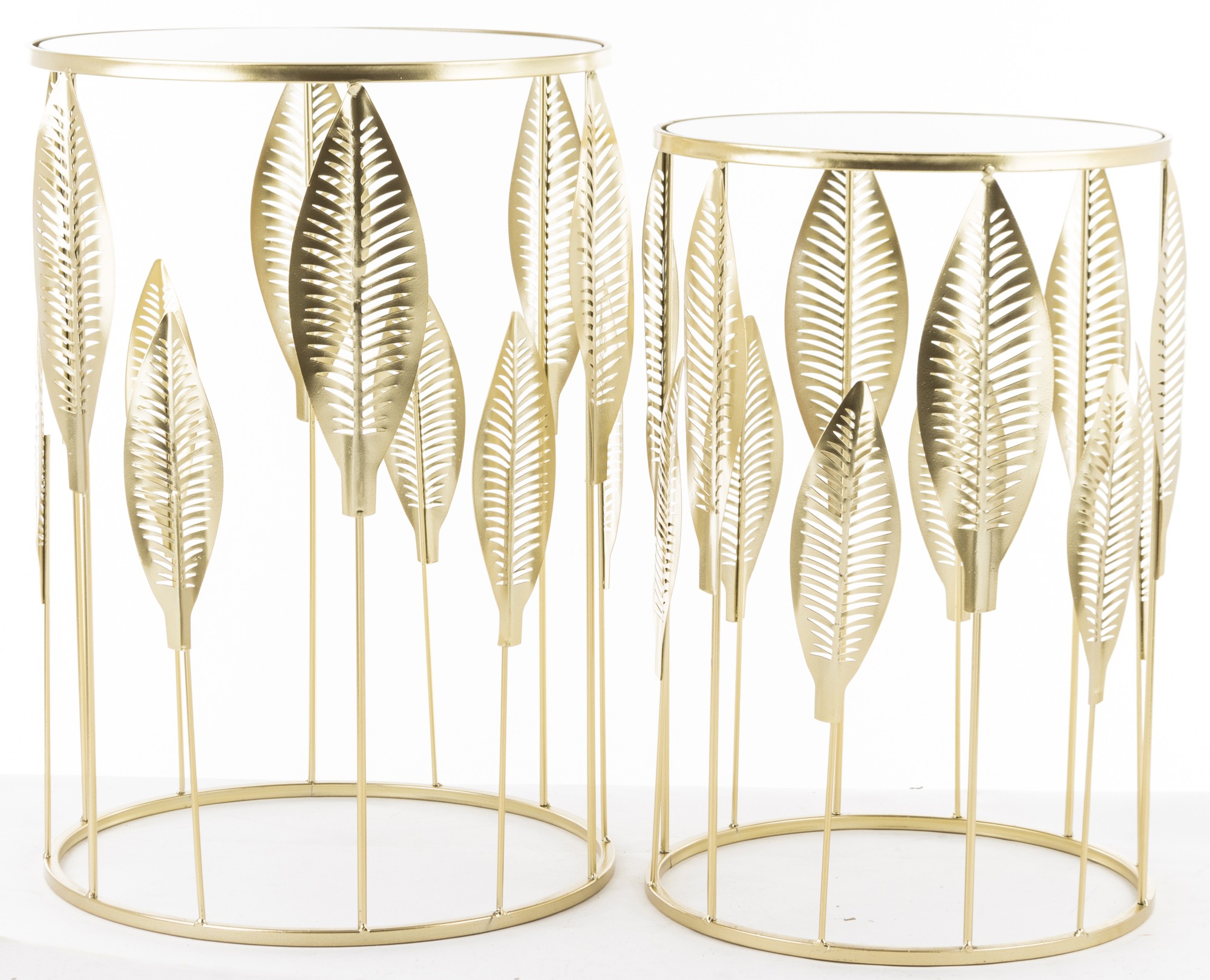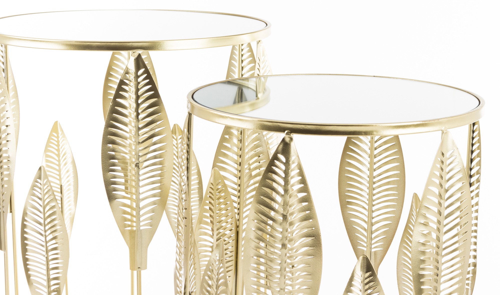 Zestaw dwóch stolików SURA w złotym kolorze z lustrzanymi blatami i dekoracyjnym motywem liści. Stylowe, eleganckie i doskonałe do luksusowych wnętrz.