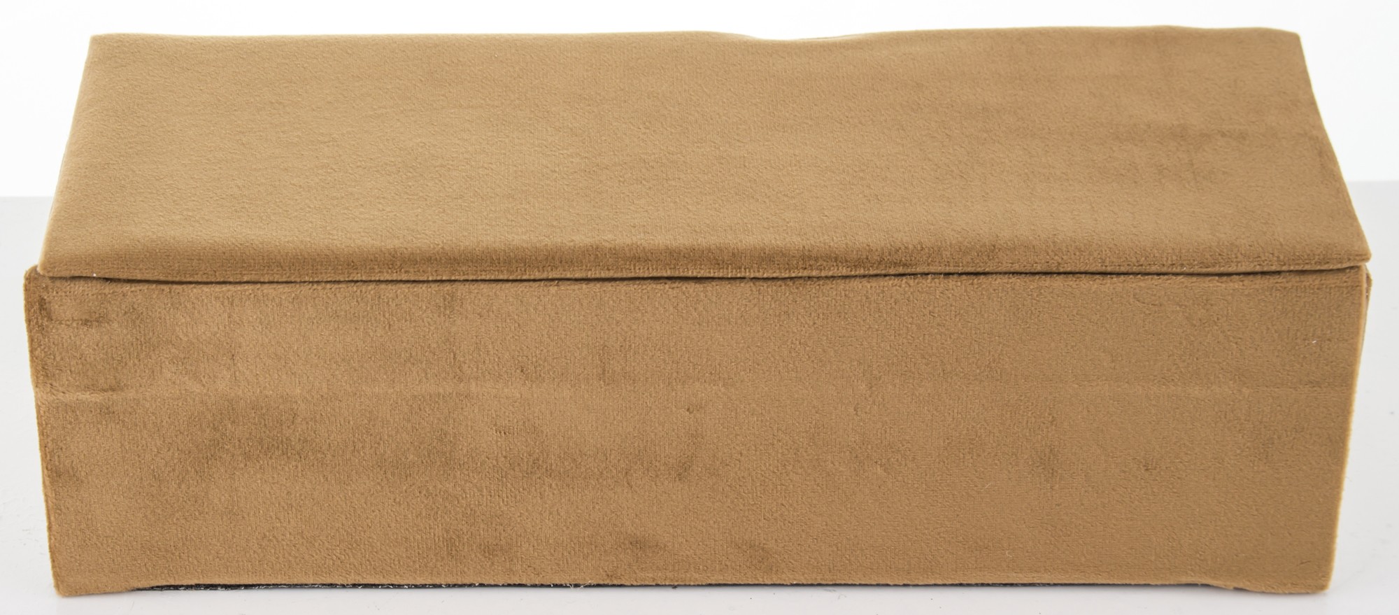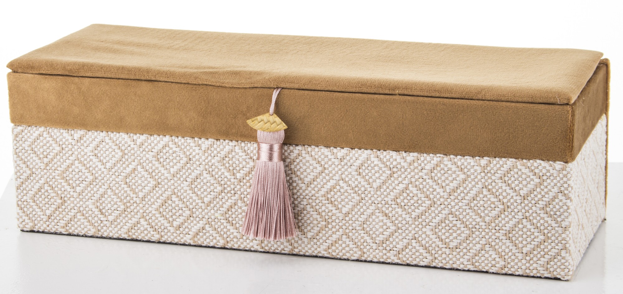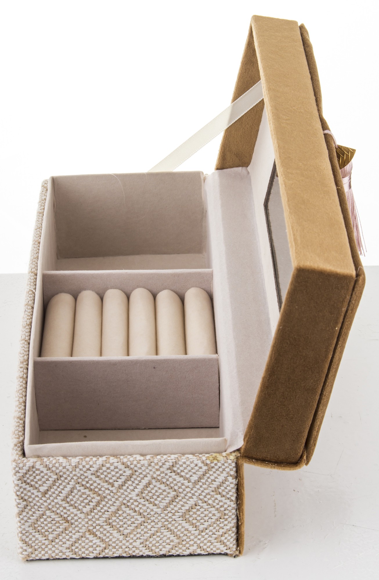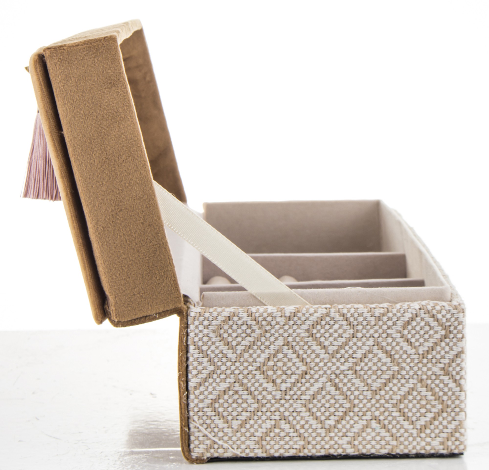 Elegancka szkatułka na biżuterię o wymiarach 8x28x10 cm, pokryta miękką tkaniną, to stylowy i funkcjonalny dodatek. Góra jest w kolorze jasnobrązowym, dolna część beżowa, a tkanina jest wytłaczana we wzór rombów. Chwost ułatwia otwieranie szkatułki. Pod pokrywą wieczka znajduje się prostokątne lusterko, a wnętrze podzielone jest na trzy równe przegrody: środkowa na pierścionki i dwie zewnętrzne na pozostałą biżuterię. Szkatułka będzie pięknie prezentować się na toaletce każdej kobiety i współgrać z jej stylem i elegancją.