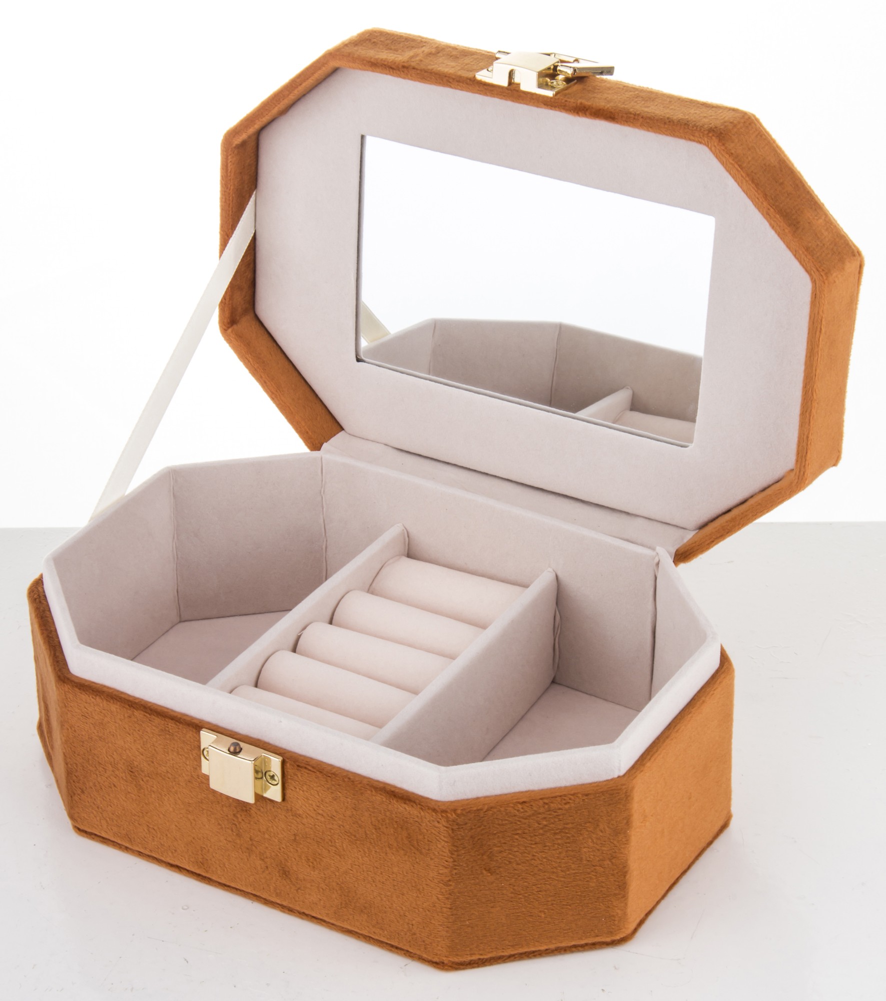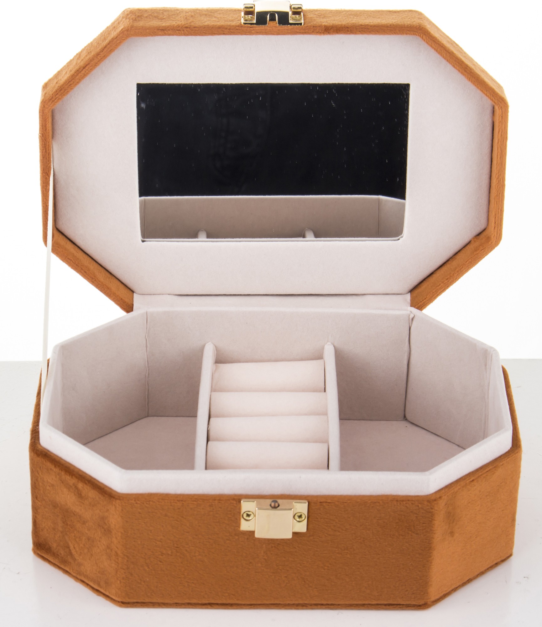 Ta elegancka szkatułka na biżuterię, o wymiarach 7,5x18x12,5 cm, to idealne rozwiązanie dla każdej miłośniczki biżuterii. Obita delikatną jasnobrązową tkaniną, szkatułka wyróżnia się swoim stylowym wyglądem i wyjątkowym wykończeniem. Złoty zatrzask dodaje jej elegancji i klasycznego uroku, a lusterko umieszczone pod pokrywą wieczka ułatwia zakładanie biżuterii. Wnętrze szkatułki zostało zaprojektowane z myślą o funkcjonalności – liczne przegródki umożliwiają przechowywanie różnych rodzajów biżuterii, od pierścionków i kolczyków, po bransoletki i naszyjniki. Dzięki temu wszystkie Twoje skarby będą zawsze w idealnym porządku i łatwo dostępne. Szkatułka jest nie tylko praktycznym, ale także eleganckim dodatkiem, który doskonale wpasuje się w każde wnętrze. Idealna jako prezent dla bliskiej osoby lub jako stylowy dodatek do własnej kolekcji. Ta jasnobrązowa szkatułka na biżuterię to połączenie funkcjonalności i estetyki, które z pewnością zachwyci każdą osobę ceniącą piękne i praktyczne rozwiązania.