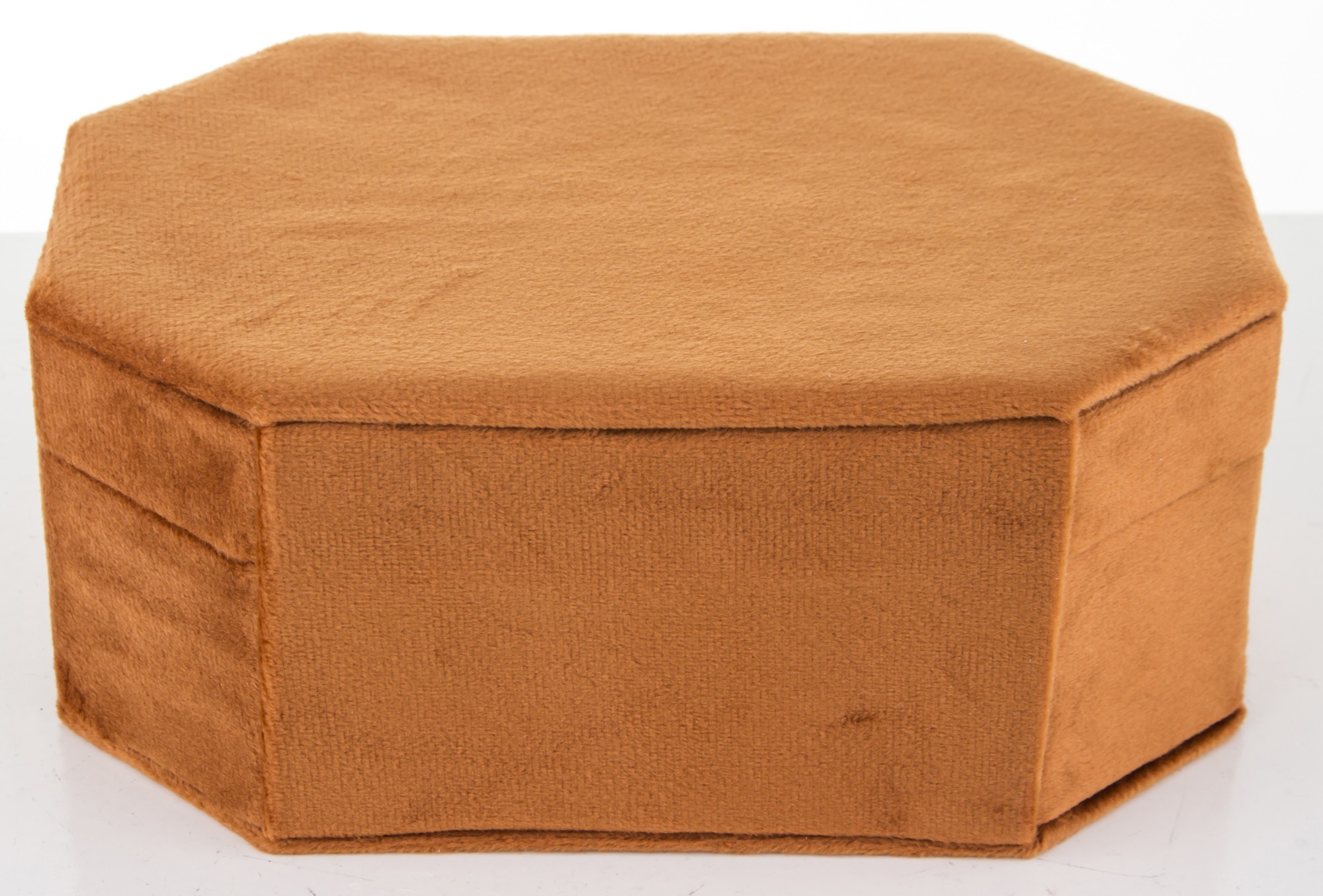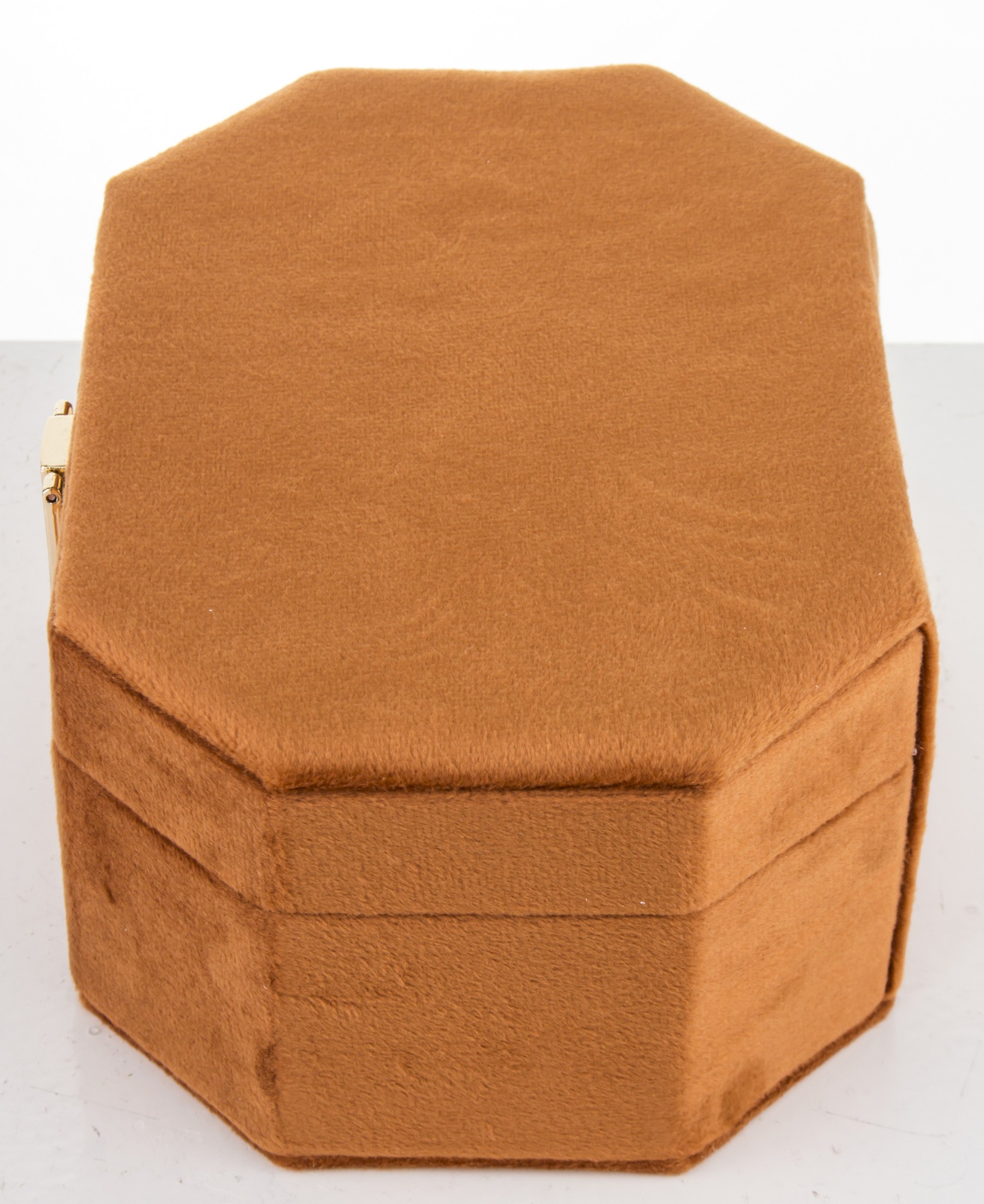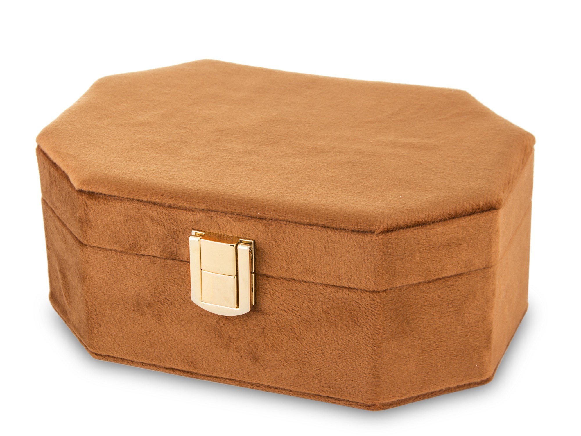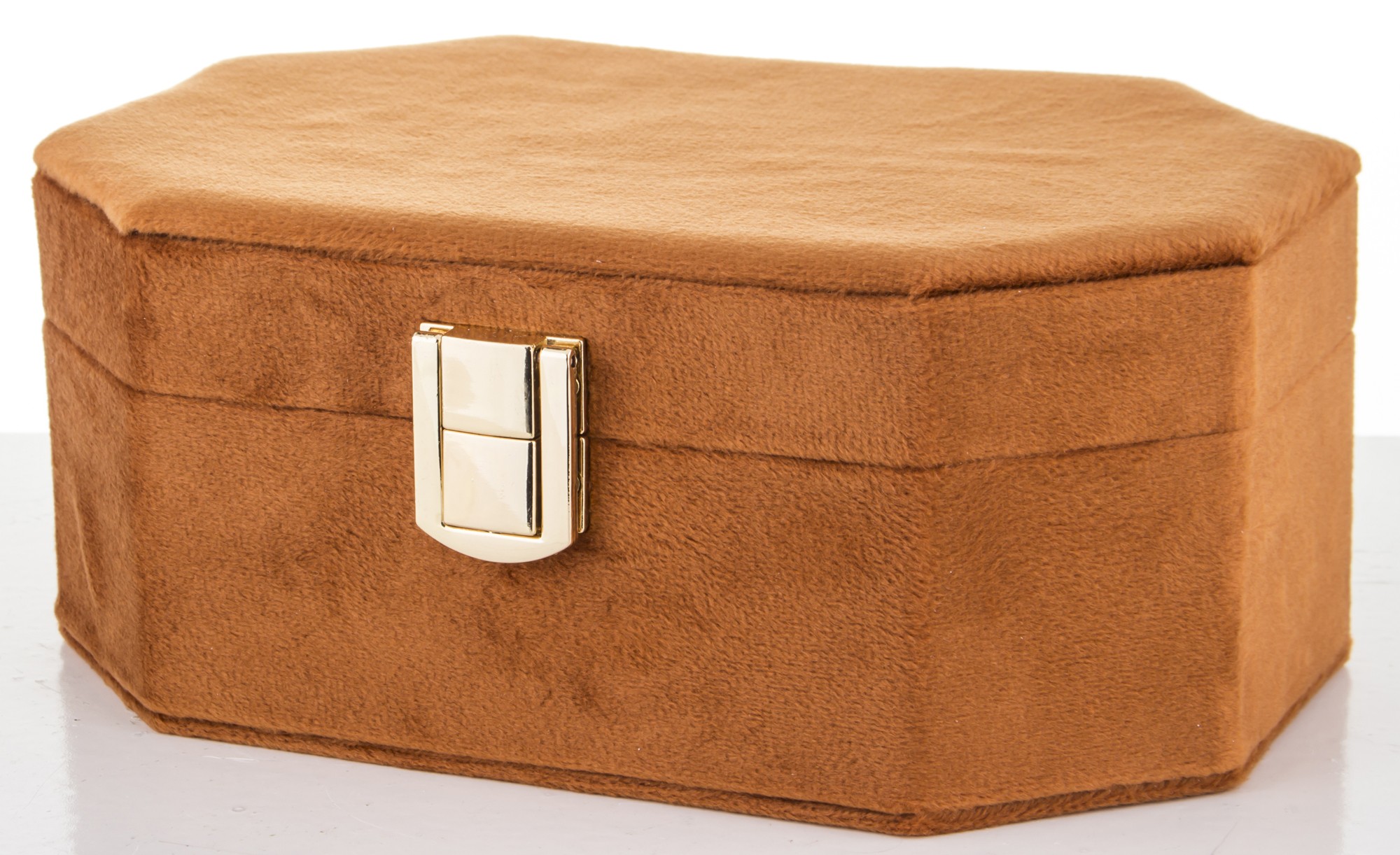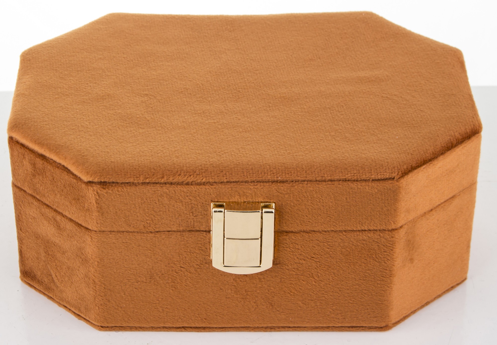 Elegancka szkatułka na biżuterię o wymiarach 7,5x18x12,5 cm, obita jasnobrązową tkaniną, to stylowy dodatek do każdej toaletki. Wyposażona w złoty zatrzask oraz lusterko pod pokrywą wieczka, oferuje liczne przegródki na różne rodzaje biżuterii. Idealna do utrzymania porządku i eleganckiego przechowywania Twoich skarbów.