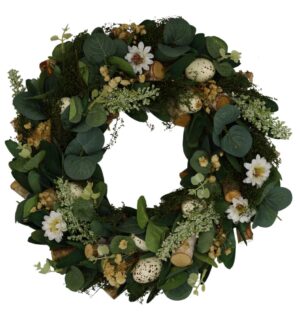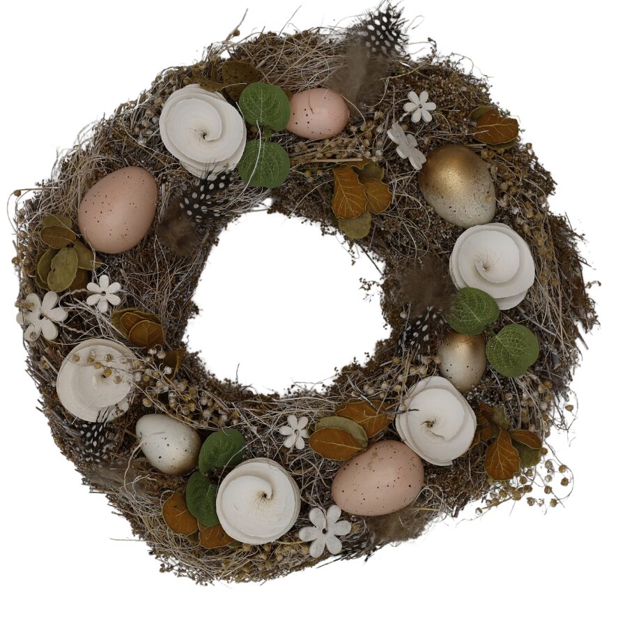Wieniec dekoracyjny MUNA wykonany z naturalnych materiałów, ozdobiony sztucznymi jajkami, kwiatami i liśćmi. Idealny na wiosenne dekoracje lub jako ozdoba wielkanocna.