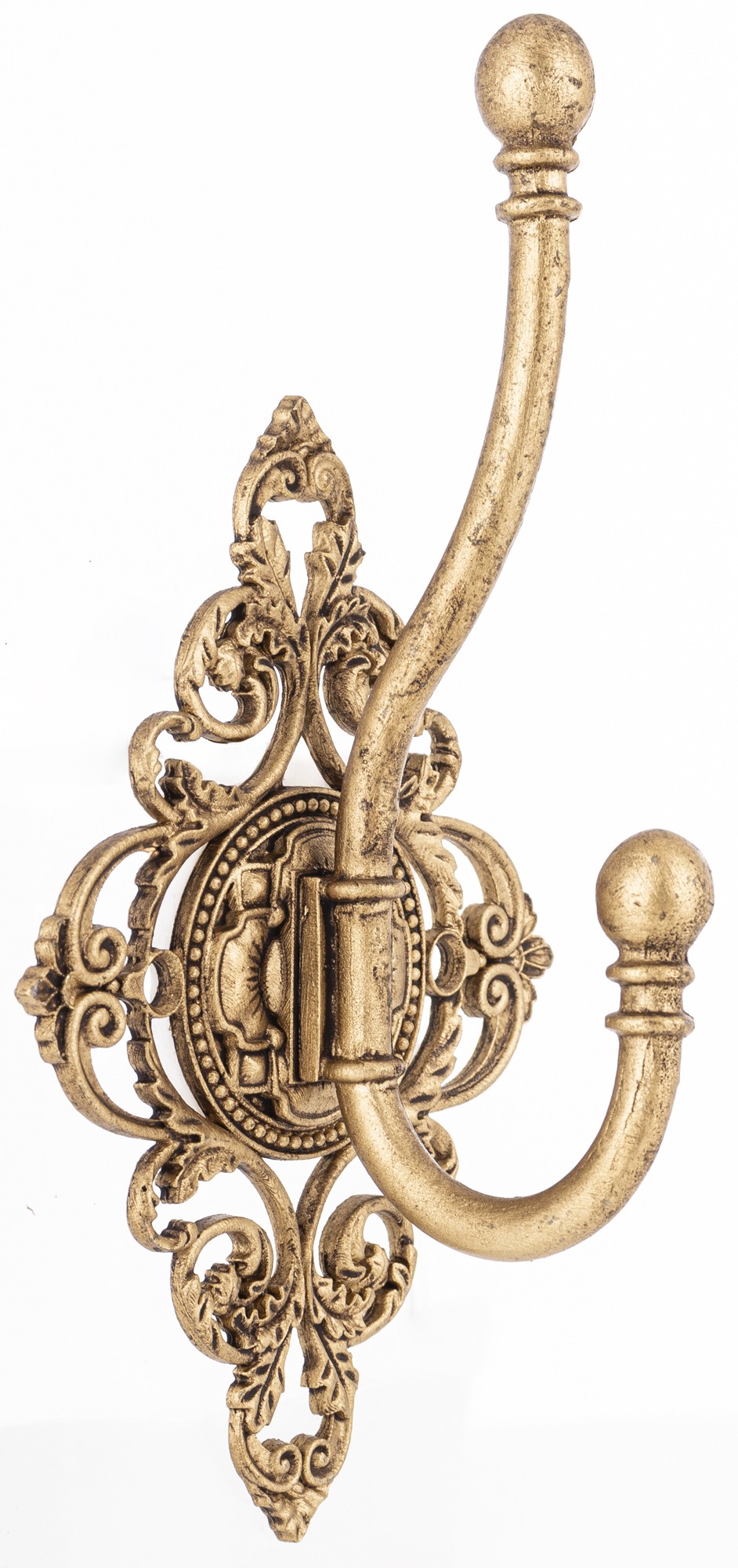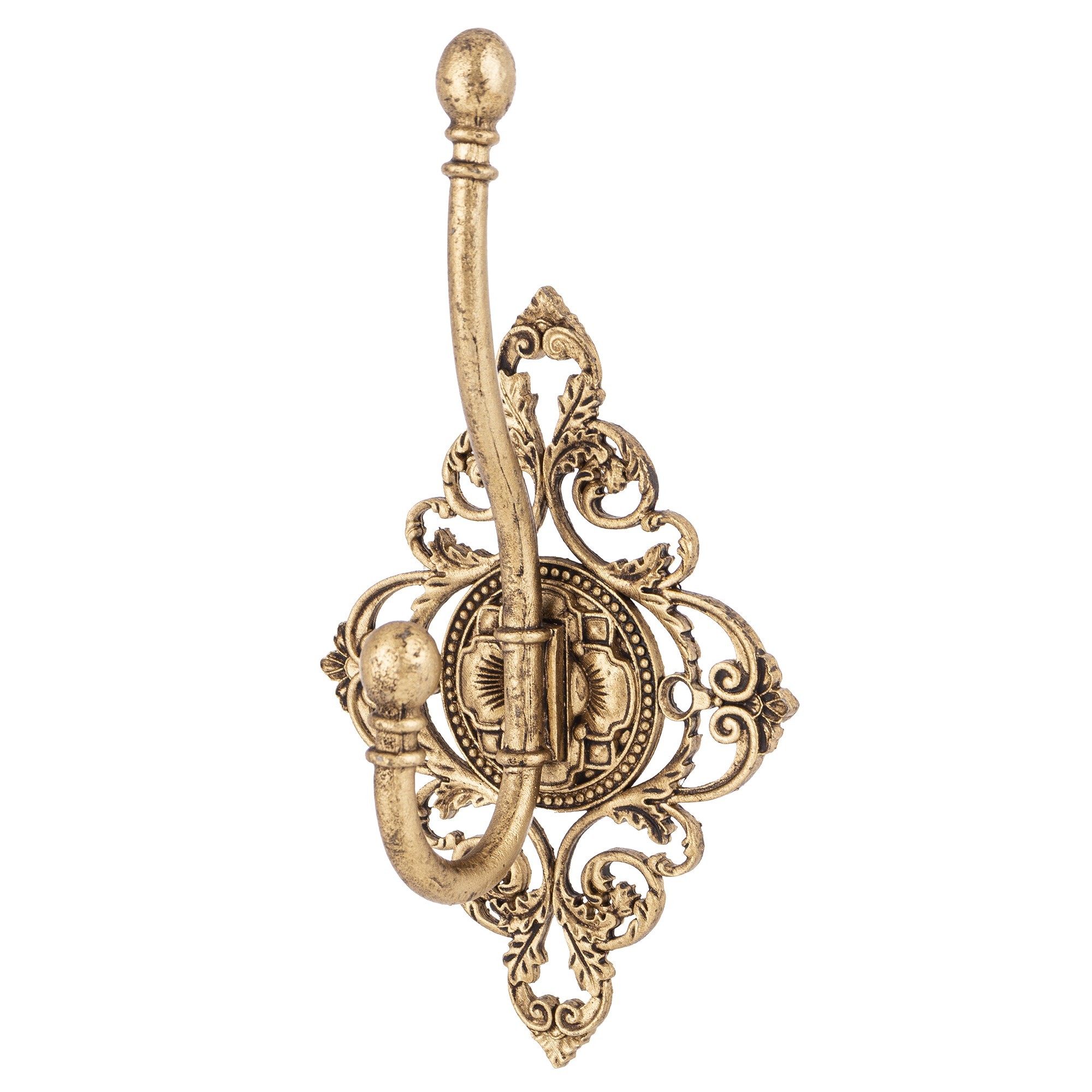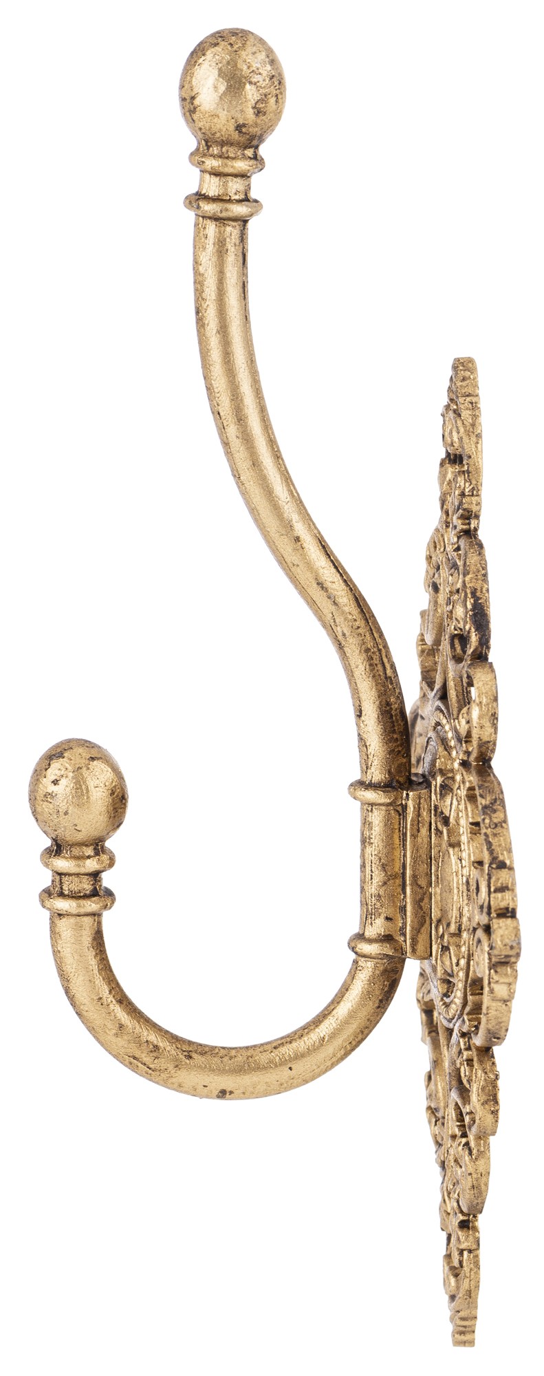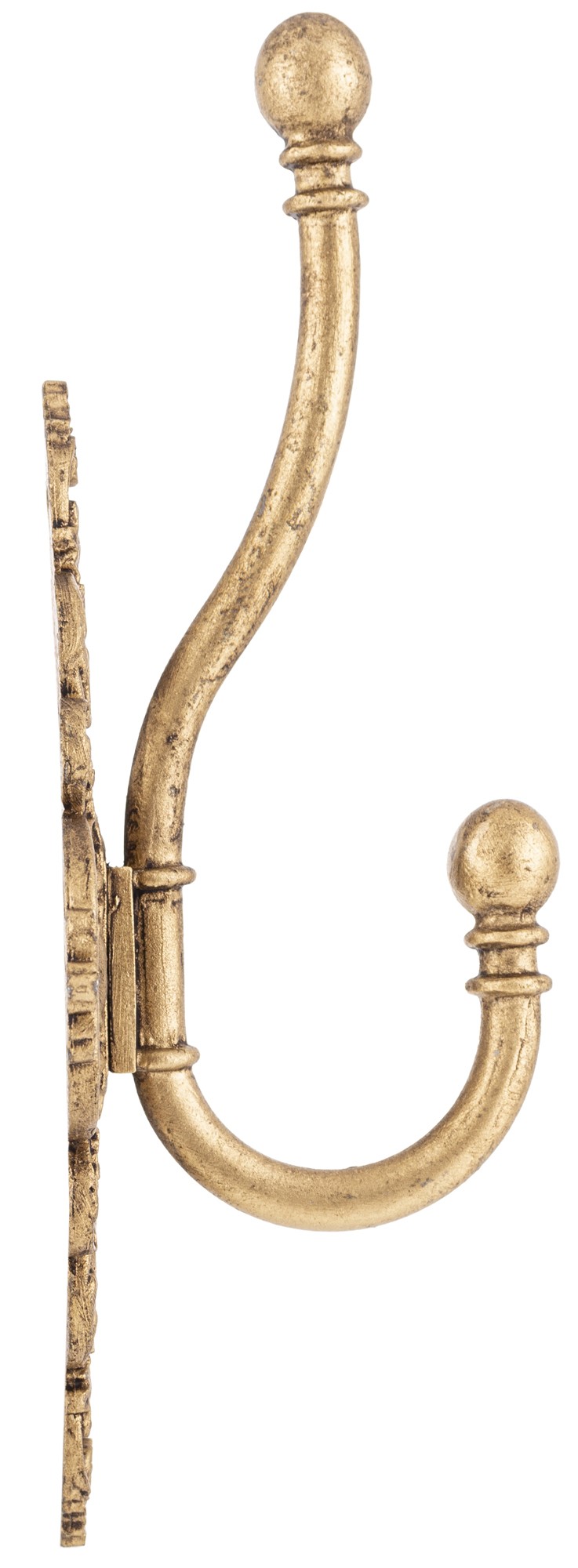 Stylowy wieszak ścienny LEO w stylu vintage, wykonany z metalu w złotym odcieniu. Piękne, misternie zdobione detale dodają elegancji i klasy wnętrzu. Idealny do przedpokoju, sypialni lub garderoby.
