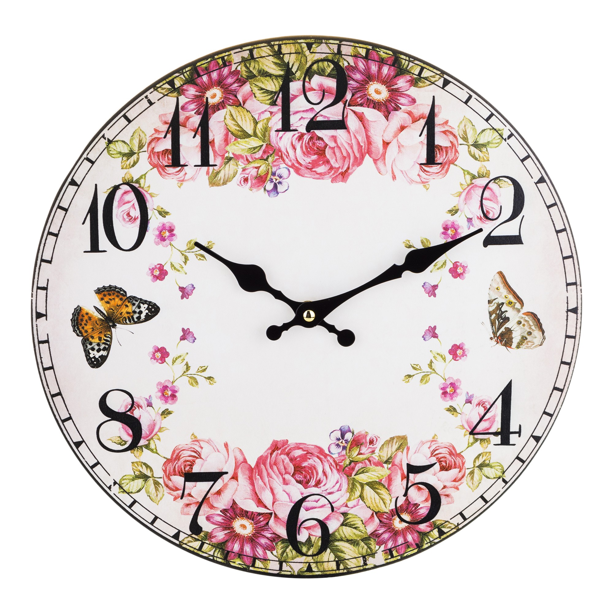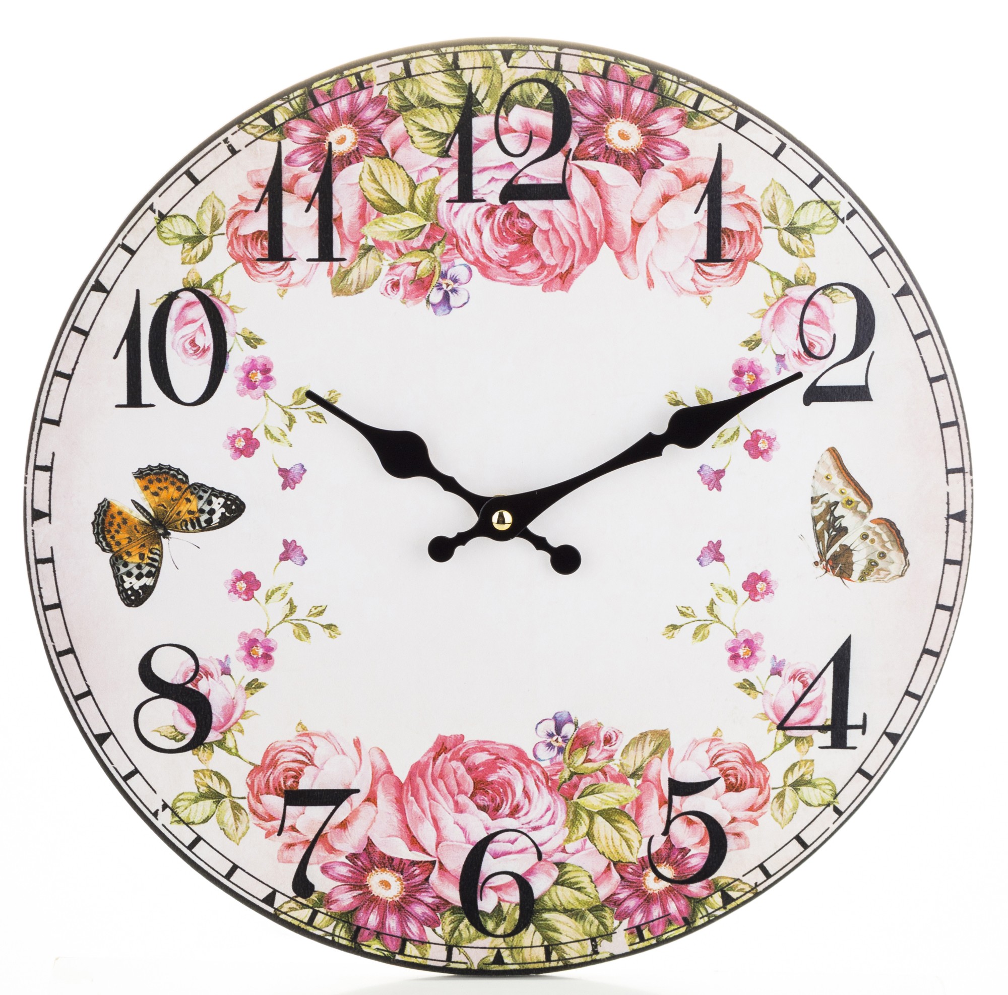 Zegar z płyty MDF bez ramki, z kremowym tłem ozdobionym kwiatami i motylami, nawiązującymi do natury. Czarne wskazówki oraz wyraźne cyfry arabskie zapewniają łatwe odczytywanie godzin. Idealny dodatek do wnętrz, które cenią sobie delikatność i inspiracje przyrodą.